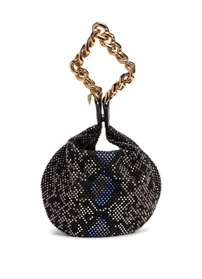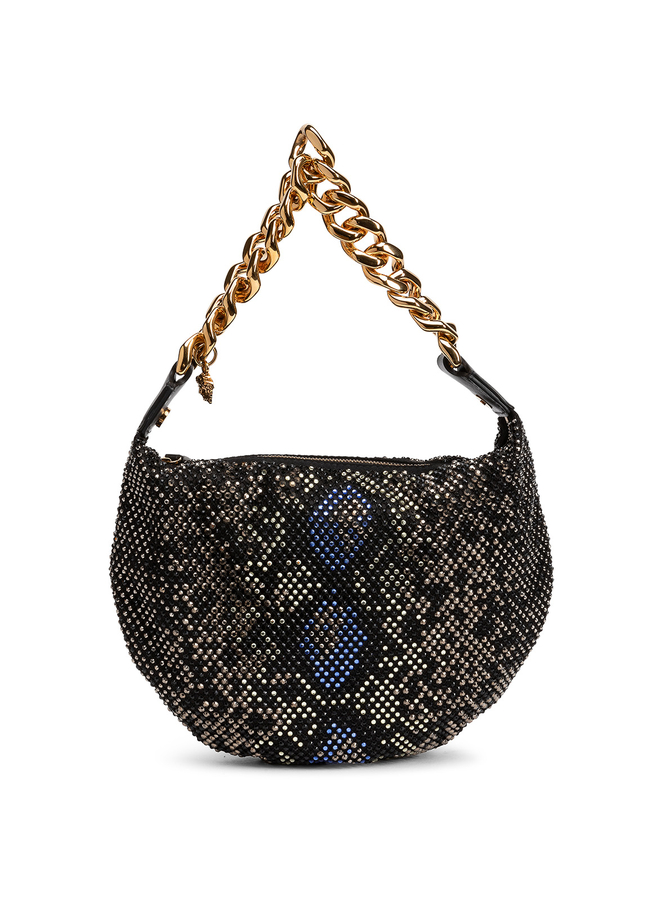 Fabric bag with stud embellishment, a python pattern, a handle in the form of a gold chain.