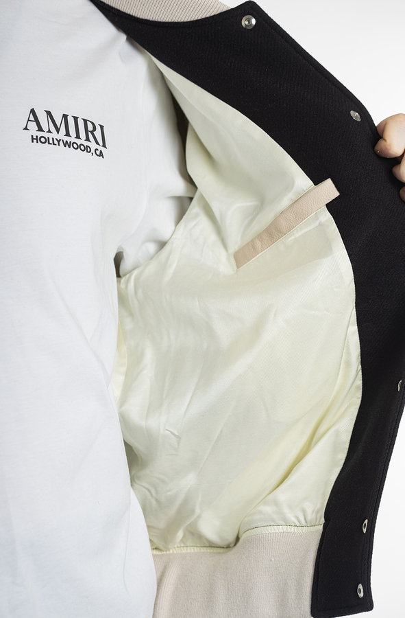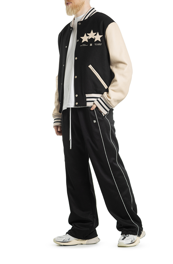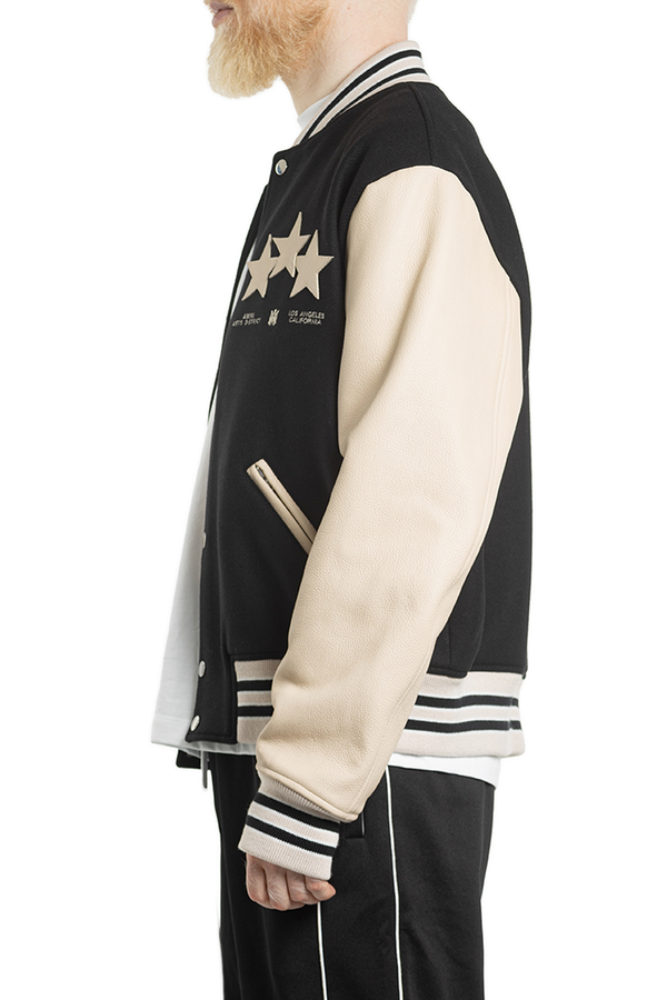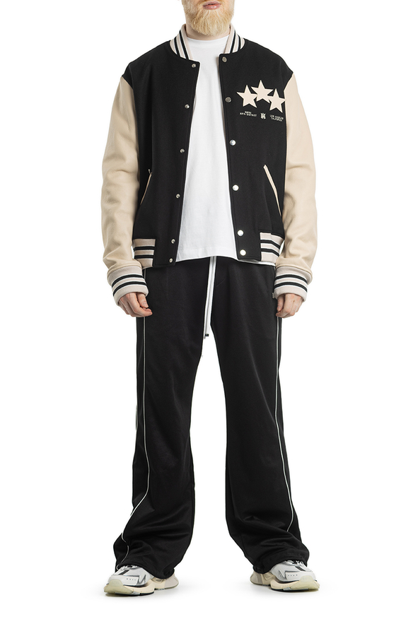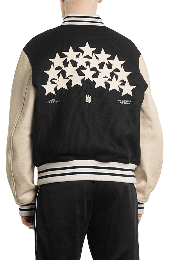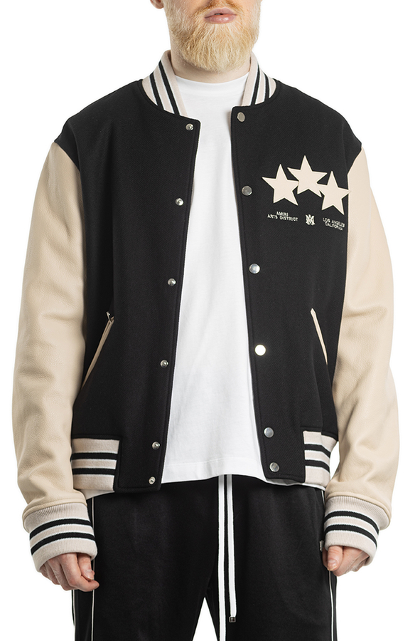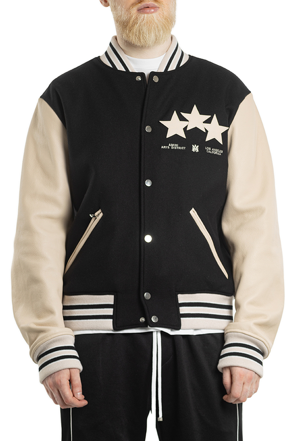 - Бомбер с длинными кожаными рукавами, застежка на кнопки спереди, два передних кармана на молнии, вышивка логотипа и фирменные звездочки на спине и груди