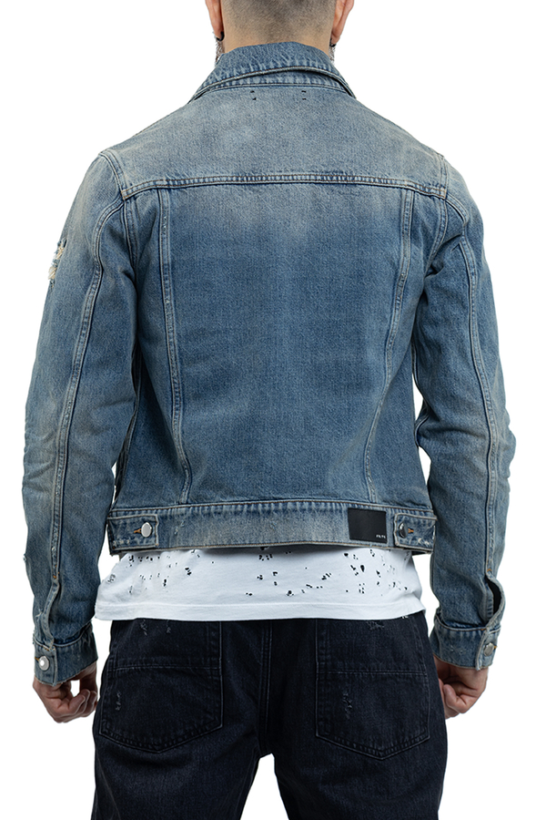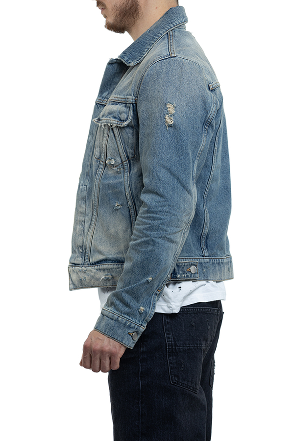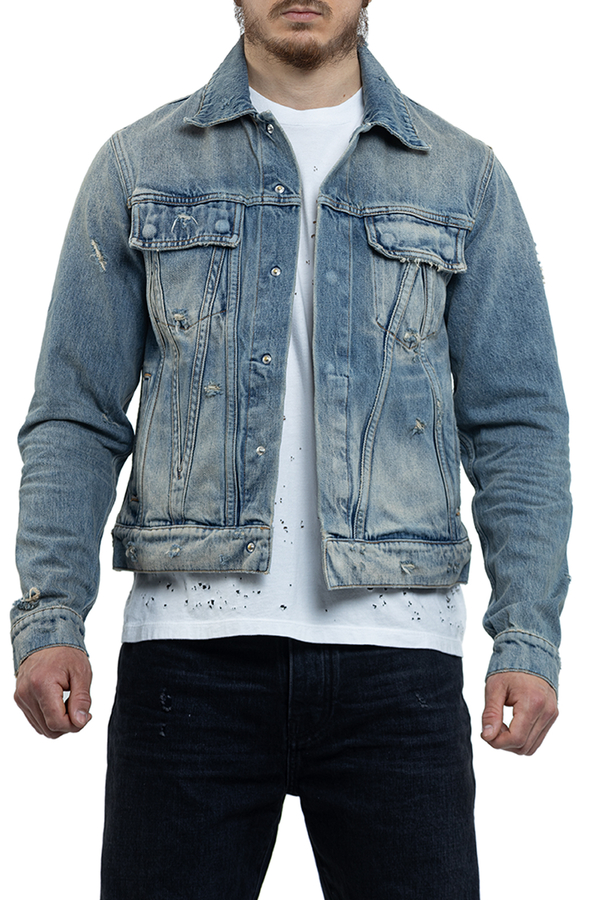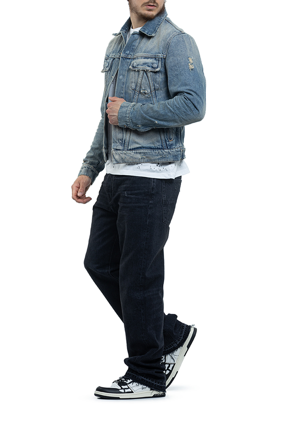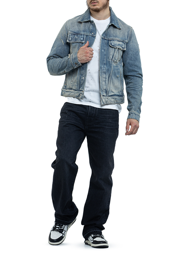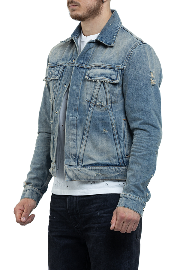 - Джинсовая куртка с эффектом потертости, классический воротник, длинные рукава с манжетами на пуговицах, два нагрудных кармана с клапанами, два боковых врезных кармана, застежка на кнопки спереди