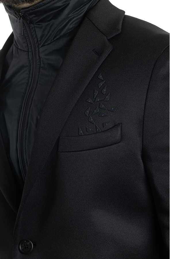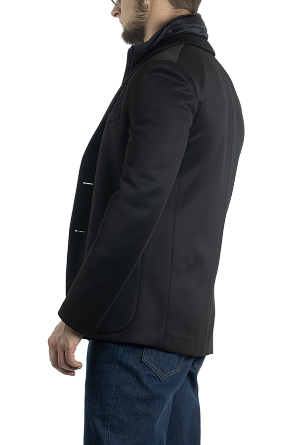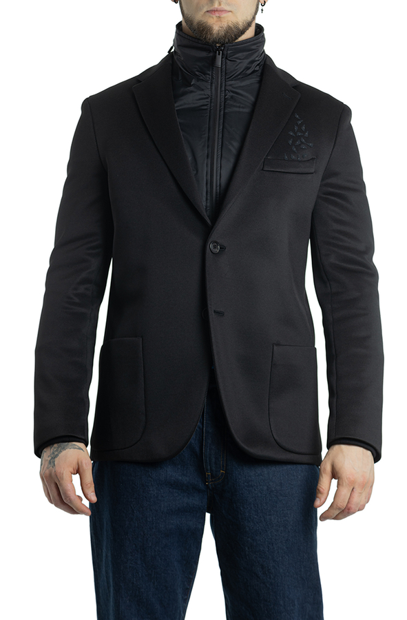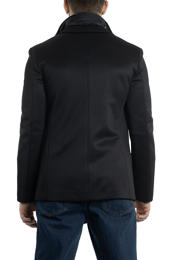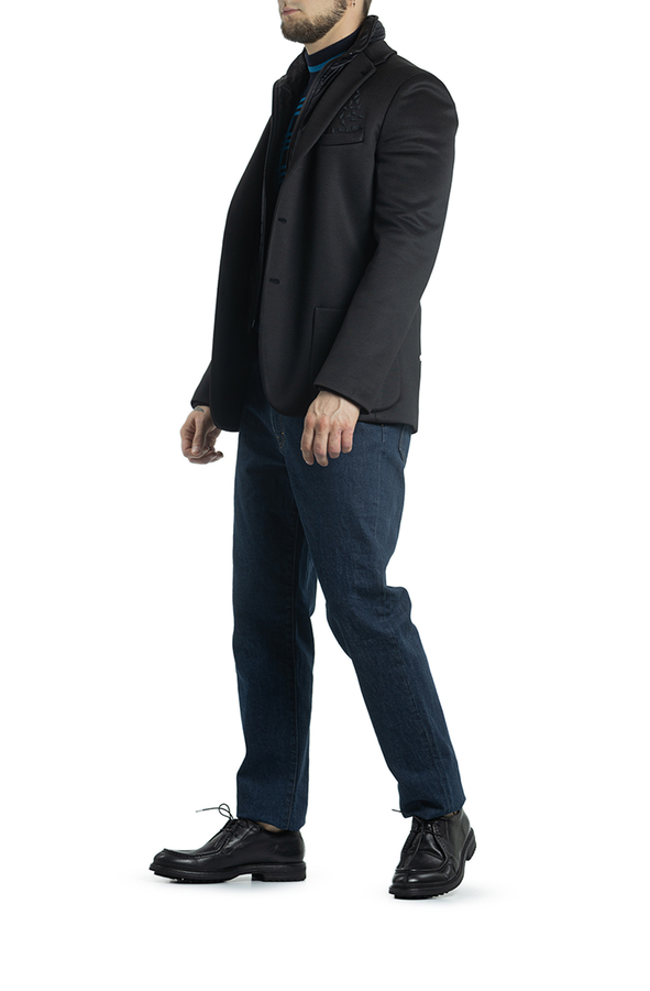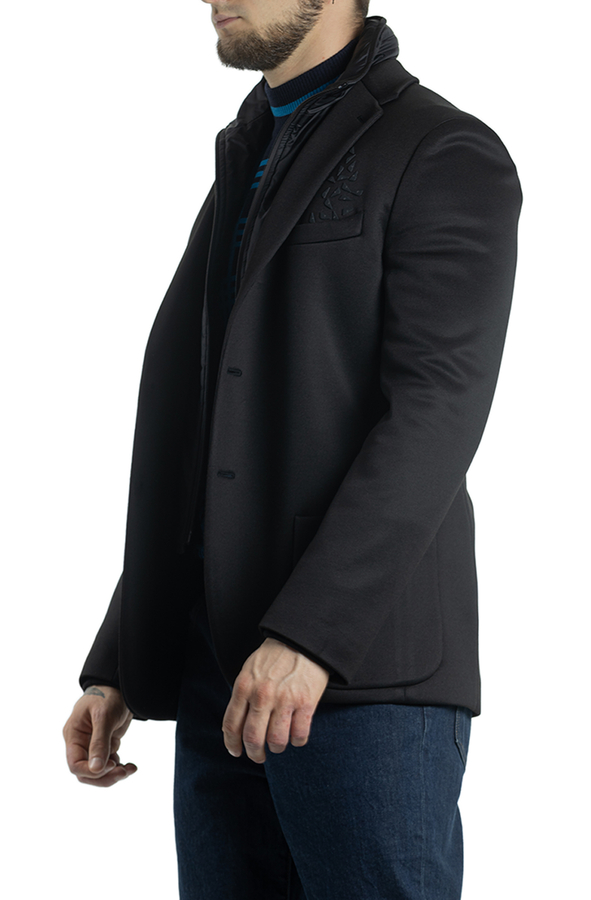 - Піджак з відстібним другим коміром і лацканами. Застібка на блискавці і на ґудзиках спереду, довгі рукави, манжети на гудзиках, нагрудна кишеня, дві передні накладні кишені.