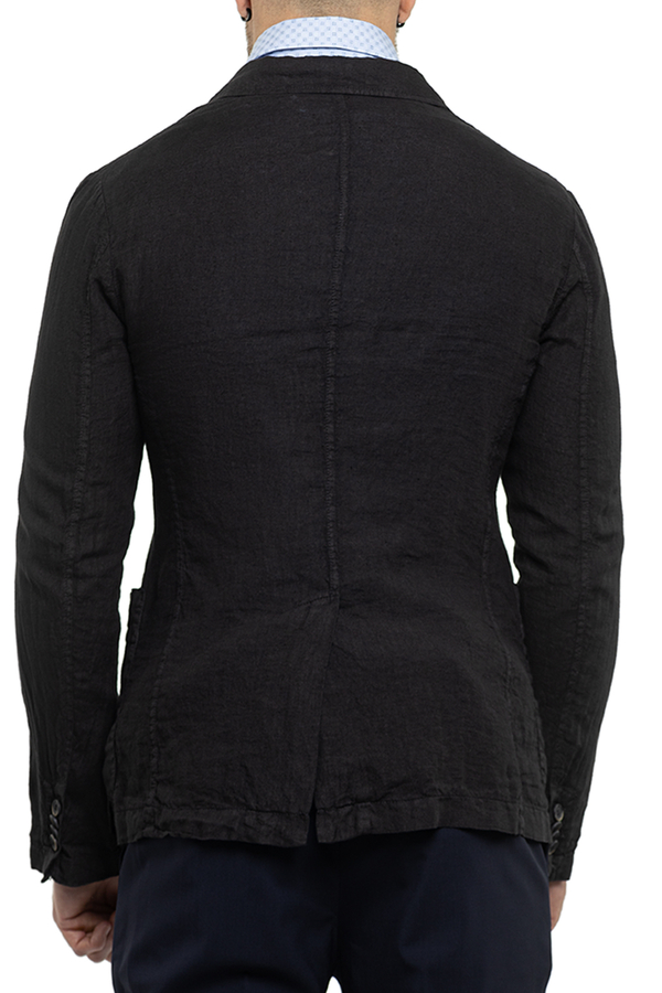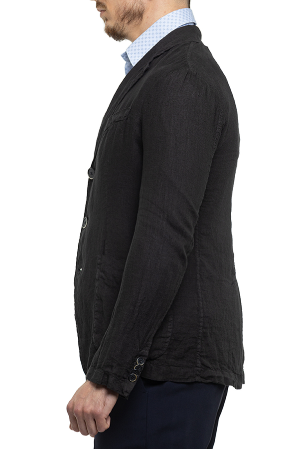 - Піджак з тонкої льняної тканини. Передні накладні кишені, нагрудна прорізна кишеня, манжети на ґудзиках. Застібка на три гудзики.