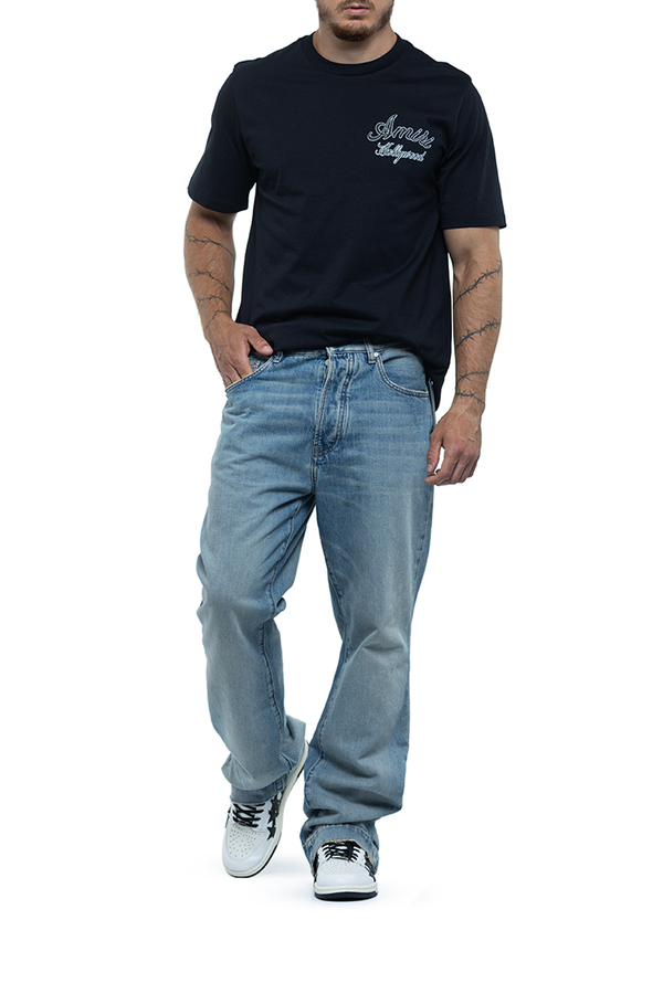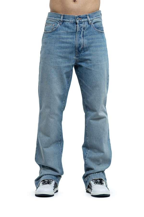 - Джинсы с классическими пятью карманами, эффект потёртости, петли для ремня, сзади нашивка с логотипом