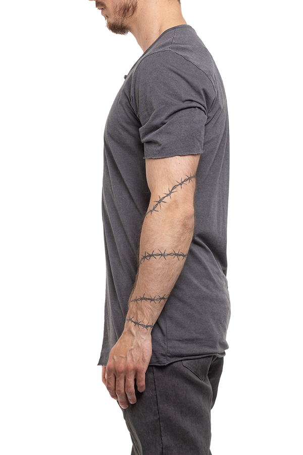 - Футболка с короткими рукавами, круглый вырез горловины, необработанные края, спереди застежка на пуговицы