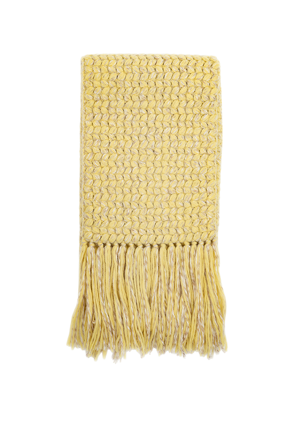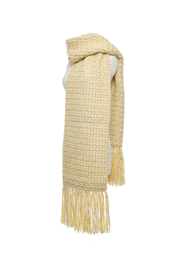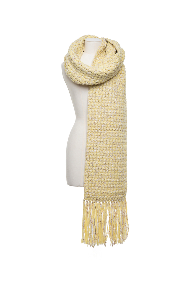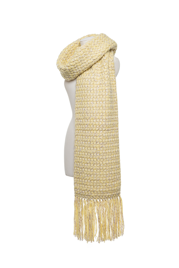 - Довгий шарф з виразною текстурною в’язкою, довга бахрома по краях