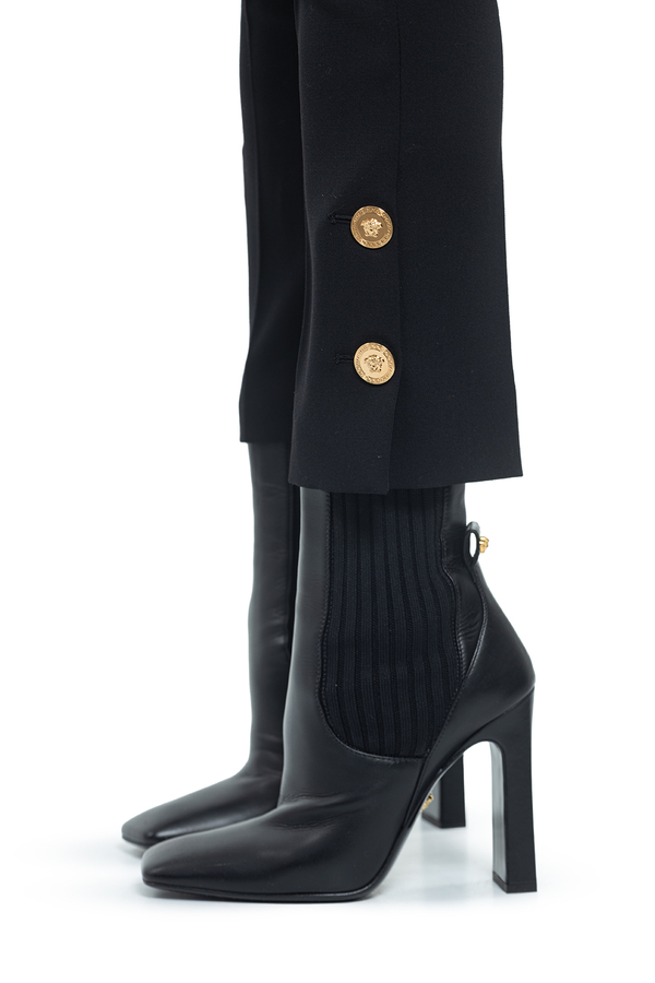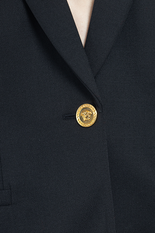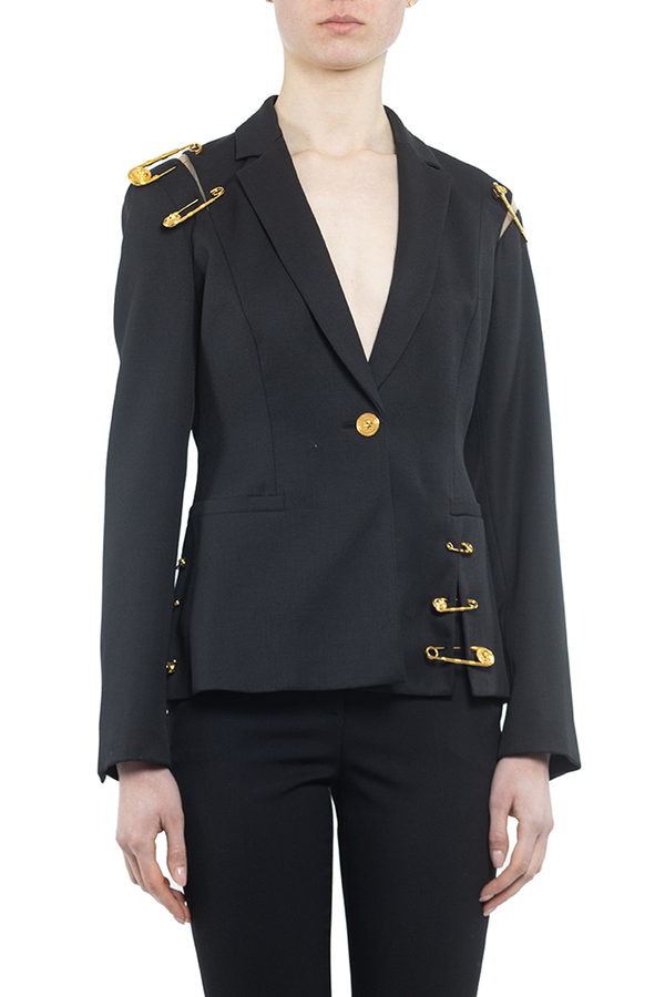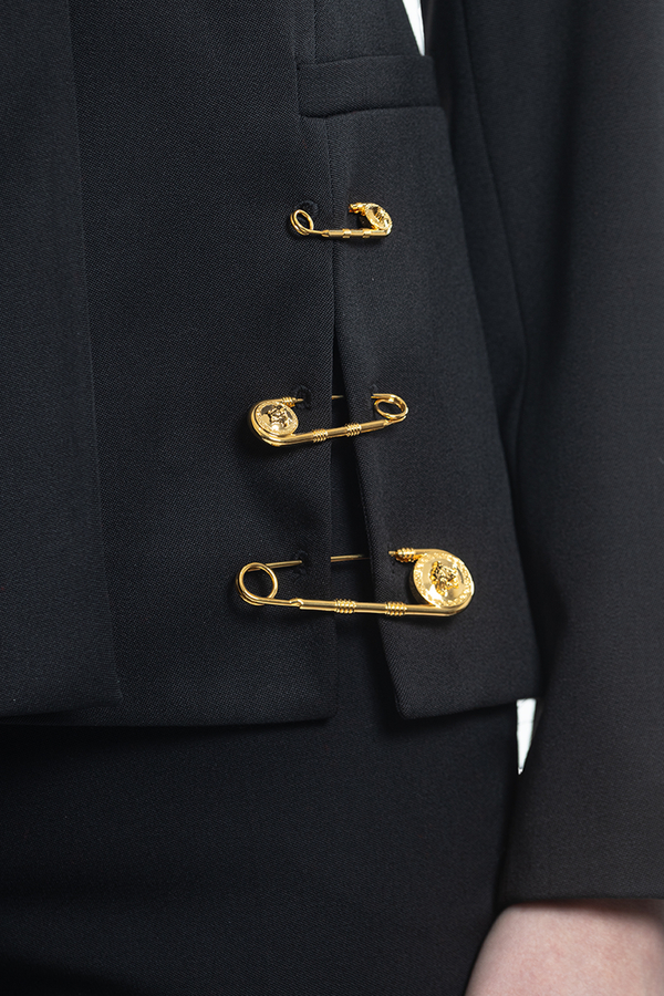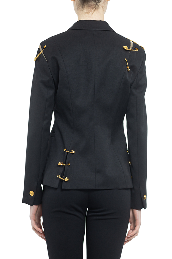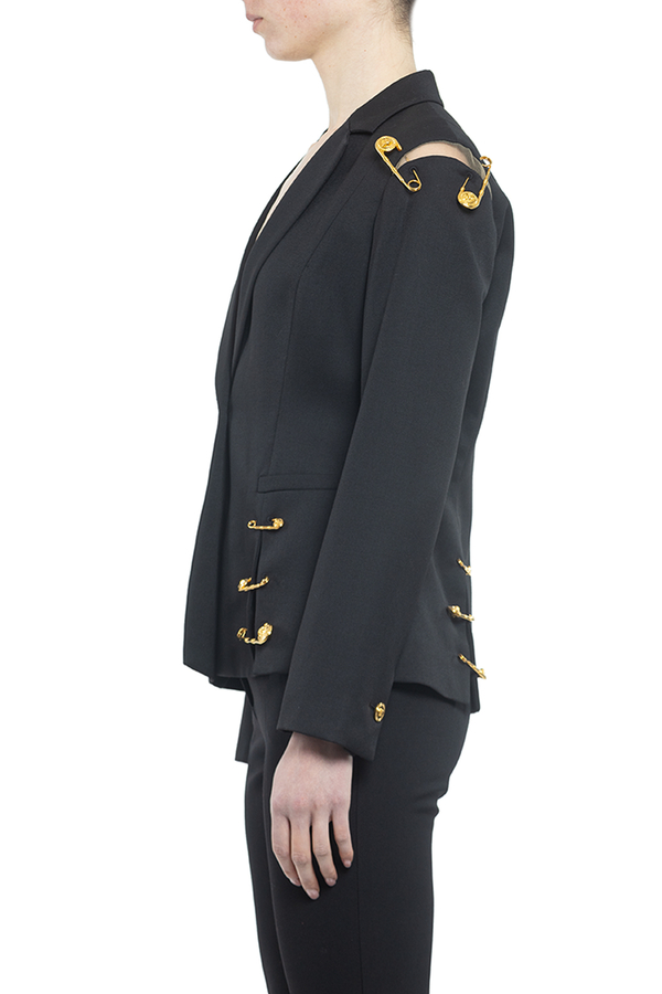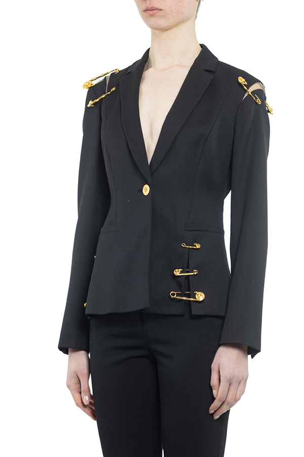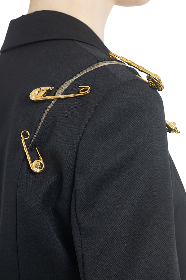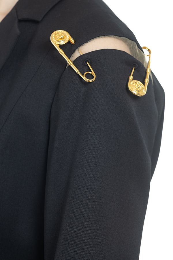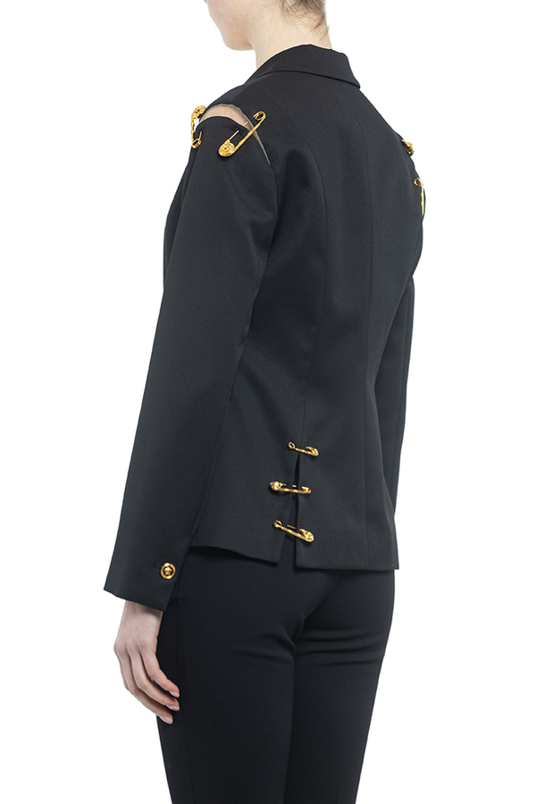 - Однобортний короткий жакет з розрізами і сітчатими вставками. Оздоблений золотистими великами булавками. Дві прорізні кишені спереду.