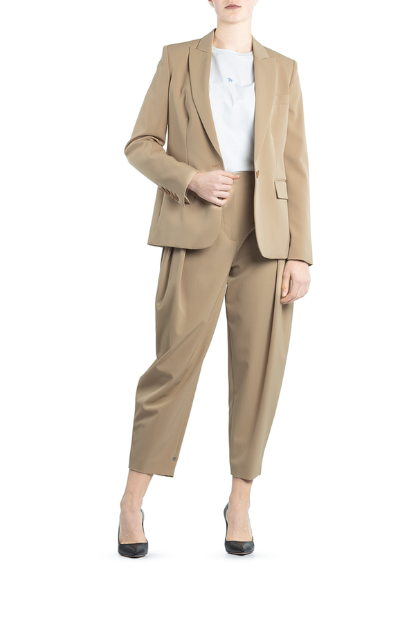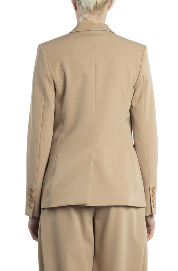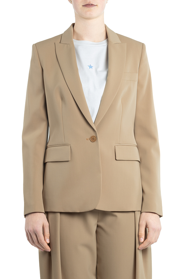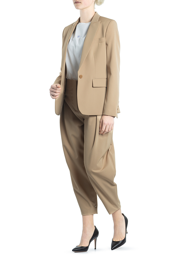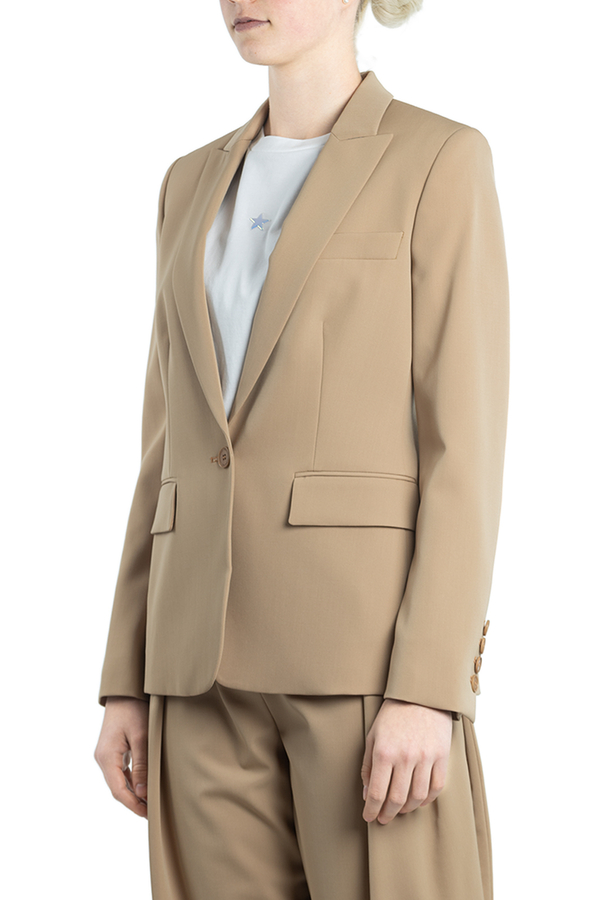 - Однобортний жакет з застібкою на один гудзик. З гострими лацканами, кишенями з клапанами, манжетами з чотирма гудзиками та підкладкою.