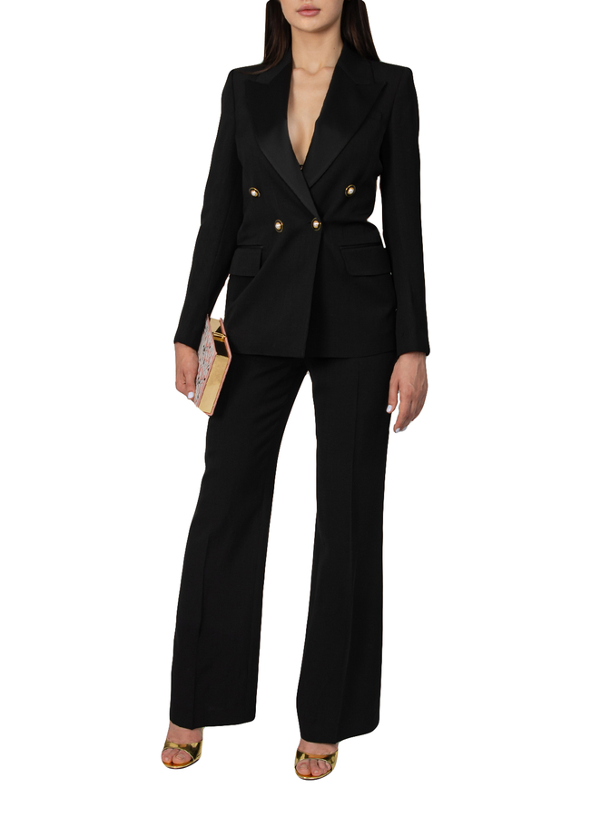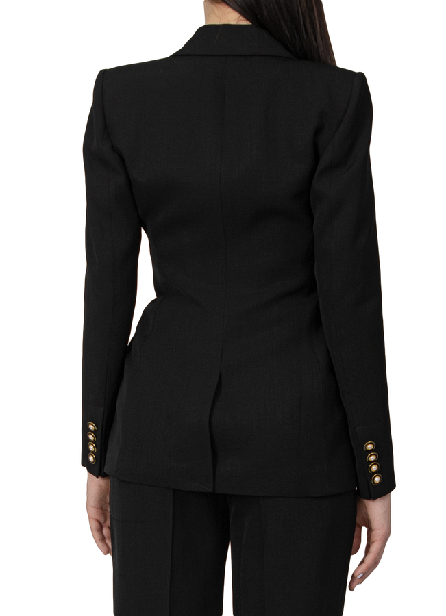 - Двухбортный жакет с подплечниками, подкладка, два боковых кармана с клапанами, манжеты и застежка спереди на пуговицы из искусственного перламутра