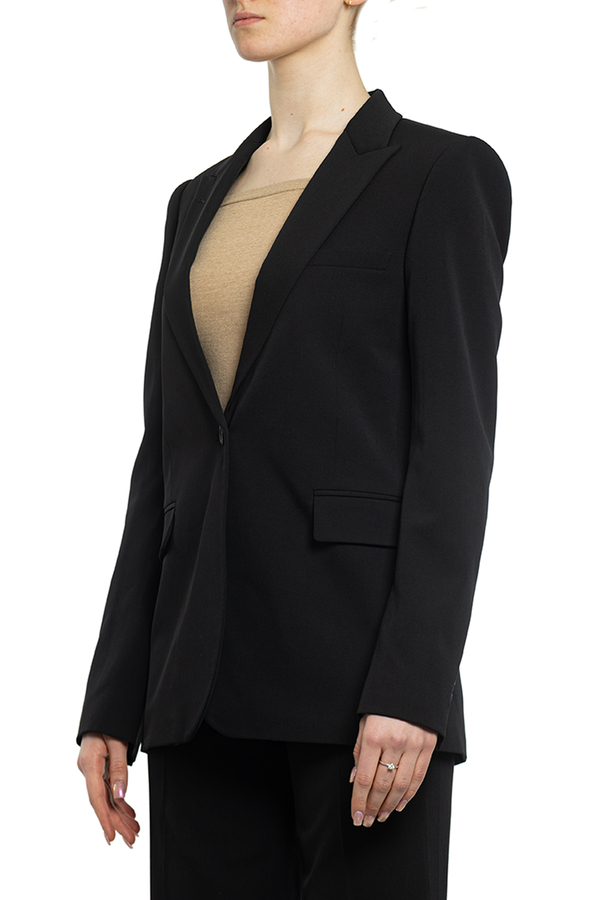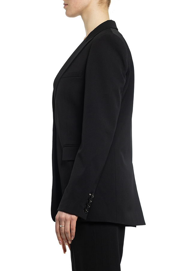 - Однобортний жакет з класичними лацканами, манжети на гудзиках, спереду дві кишені з клапанами та прорізна нагрудна кишеня, застібка на гудзик, ззаду шліца