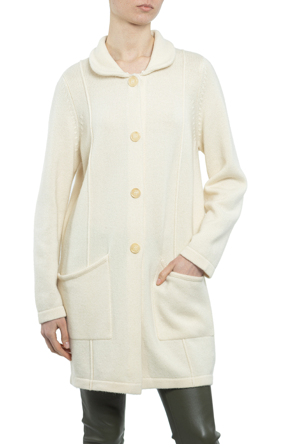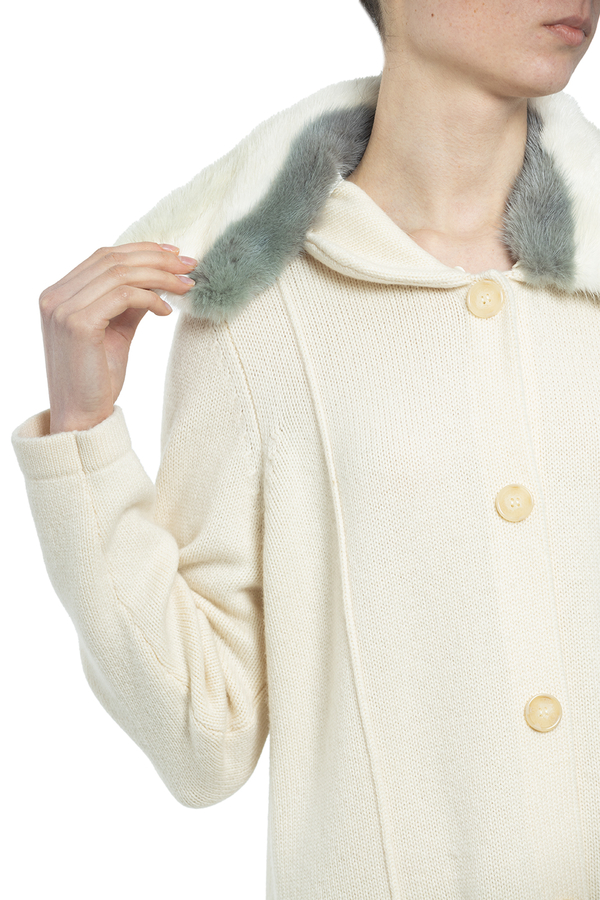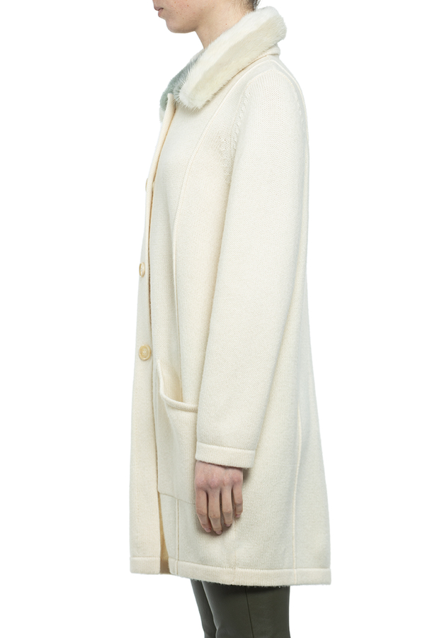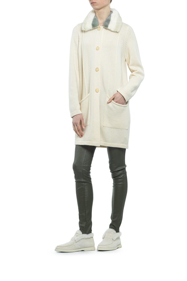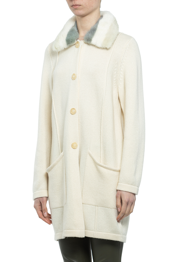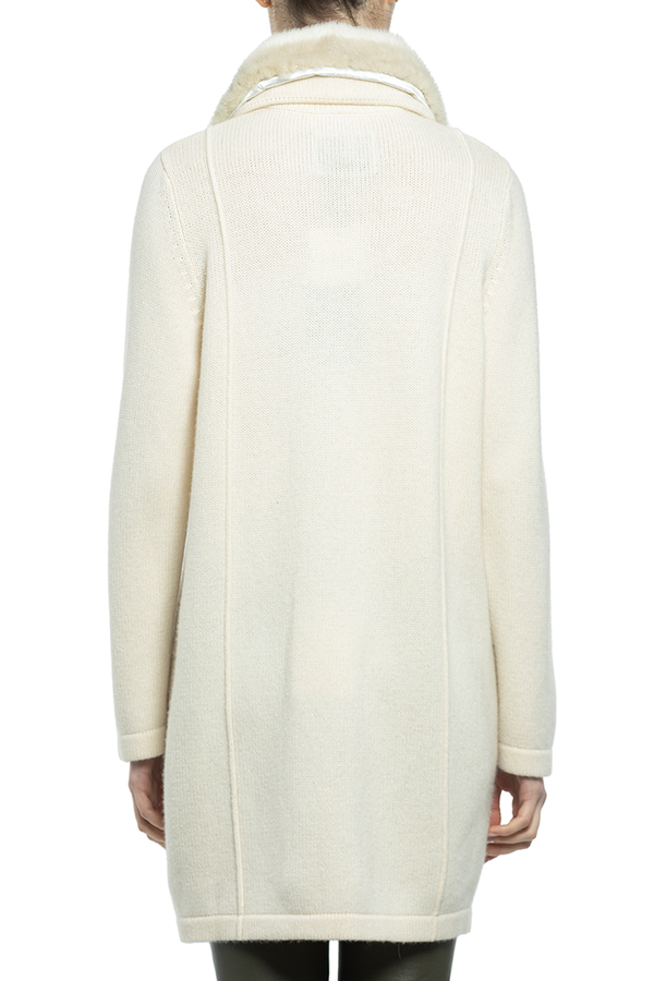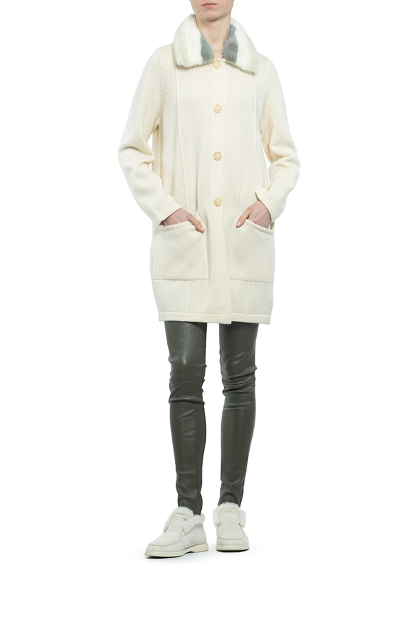 - Довгий кардиган з накладними кишенями і хутряним коміром. Застібка на гудзики, прямого крою.