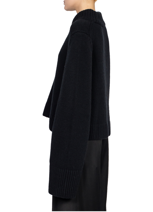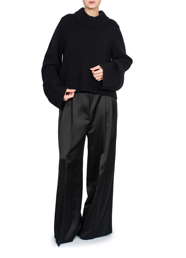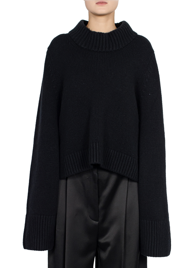 - Кашеміровий джемпер в рубчик з довгими широкими рукавами з розкльошеними манжетами. Висикий виріз горла з ребристою деталізацією. Прямий подол.