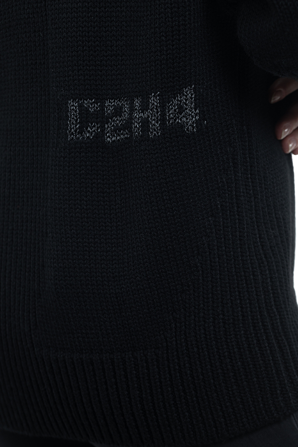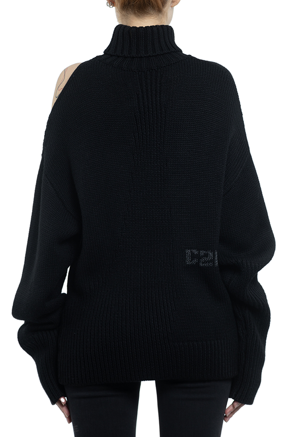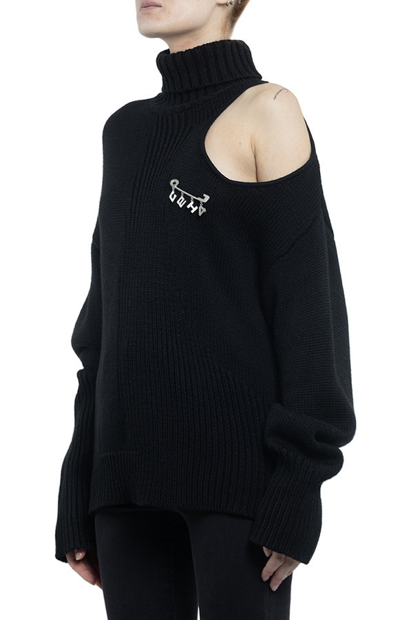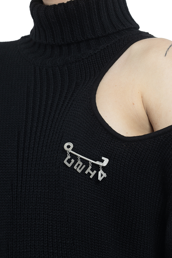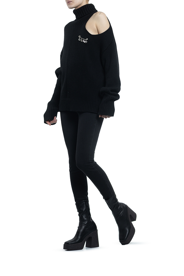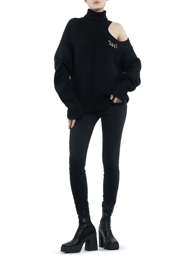 - Светр з високим коміром. З відкритим плечем і прикрасою - металева шпилька. Довгі рукава з еластичними ребристими манжетами.