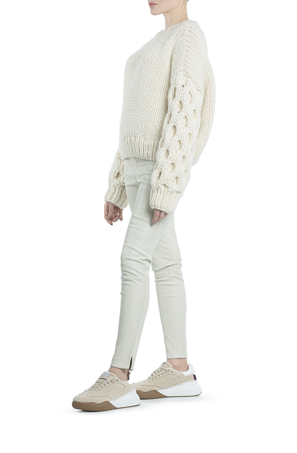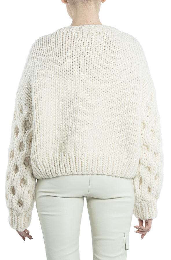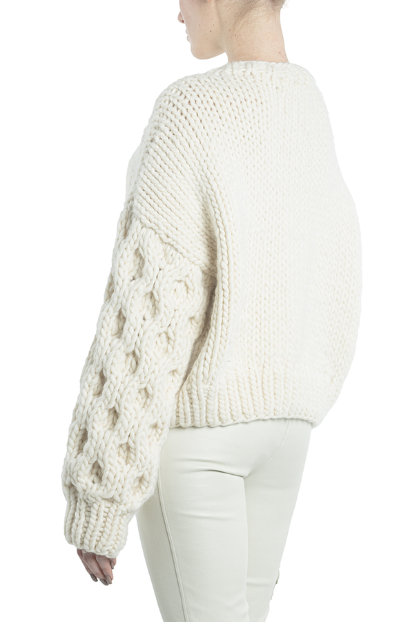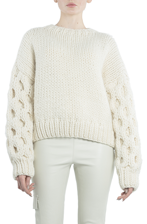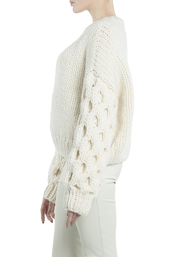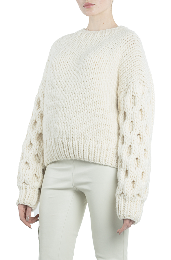 - Светр з вовни дизайну оверсайз з ажурними рукавами-коконами і круглим вирізом горловини.