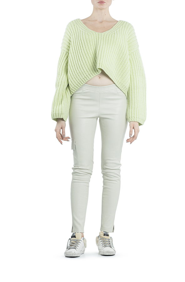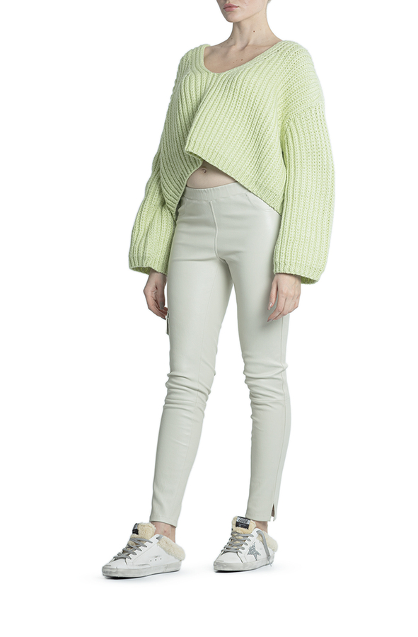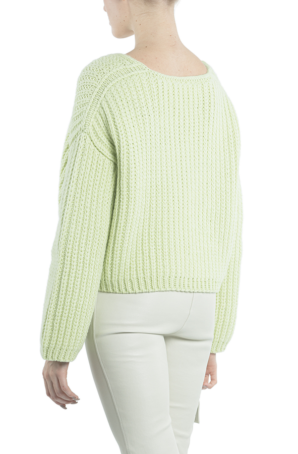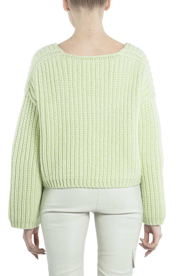- Короткий джемпер з V-образним вирізом вільного крою. Плетіння крупної фактури.