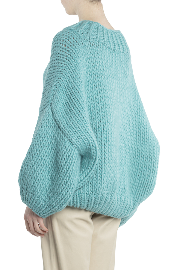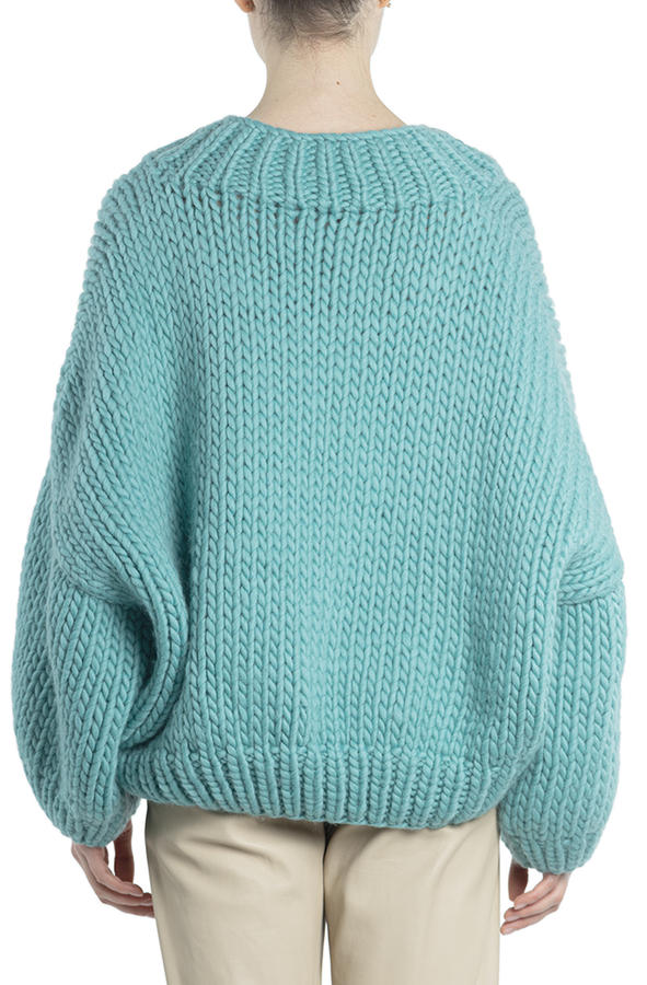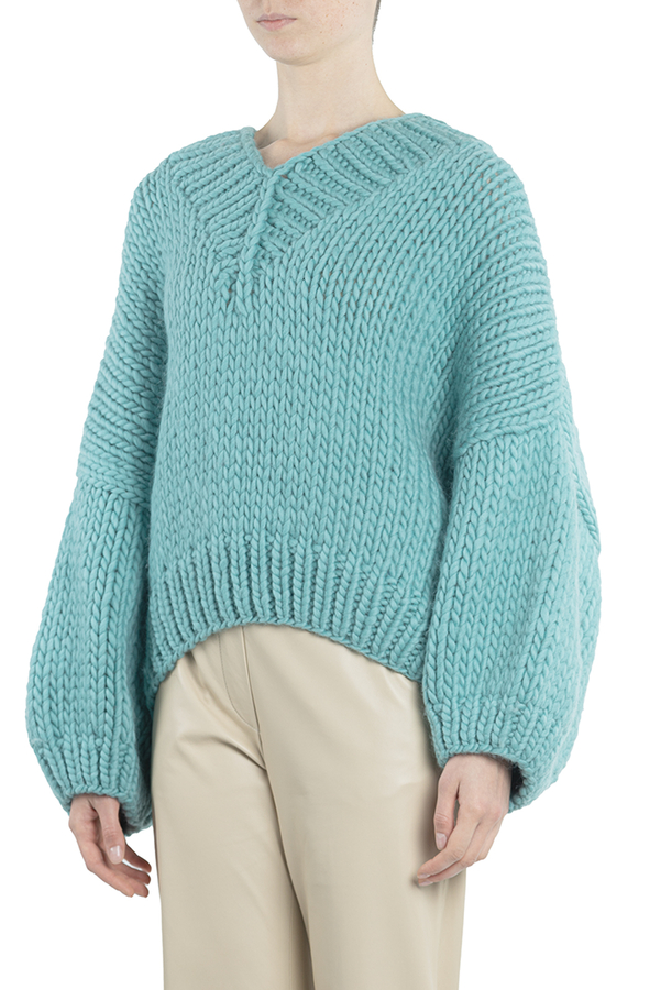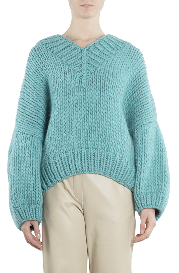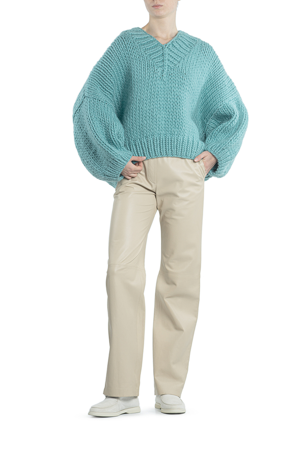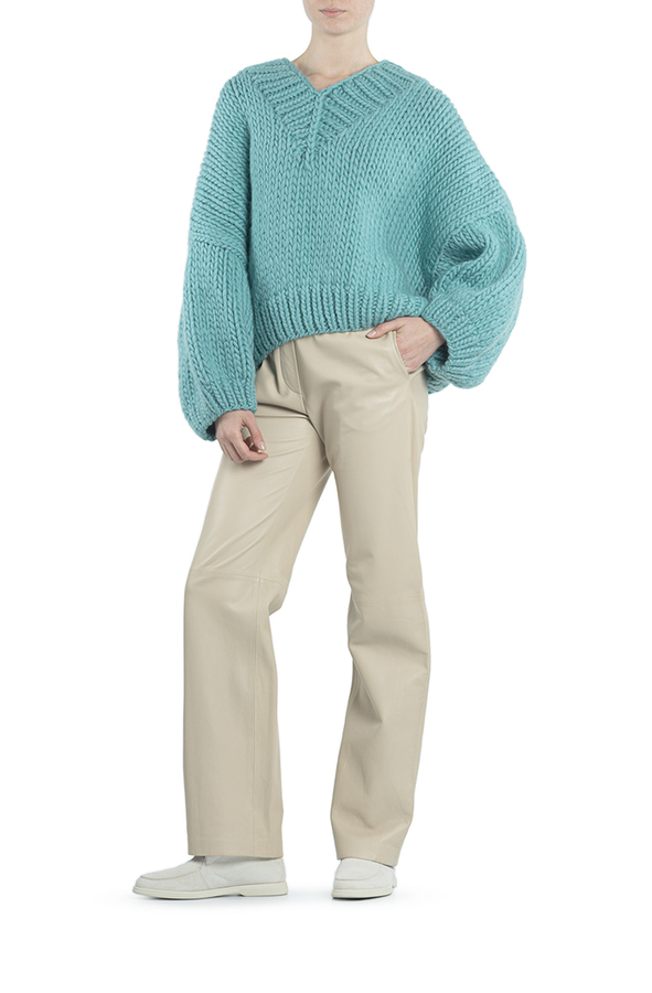 - Светр з V-образним і довгими рукавами. Плетіння крупної фактури.