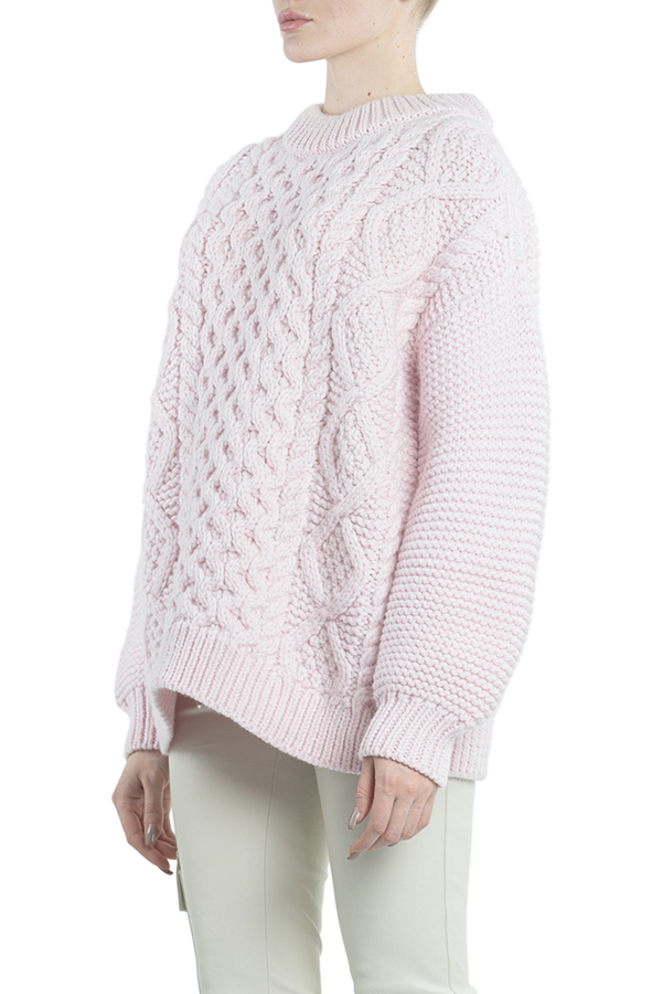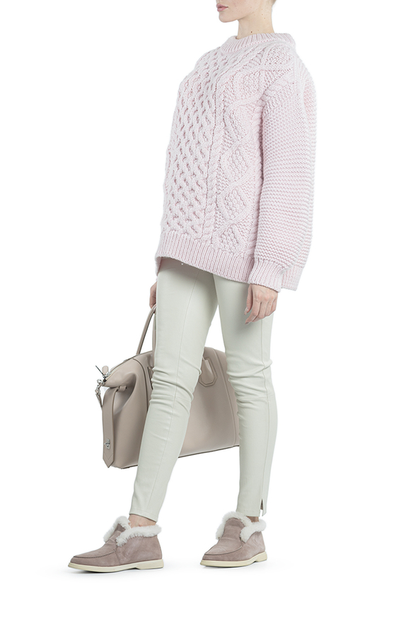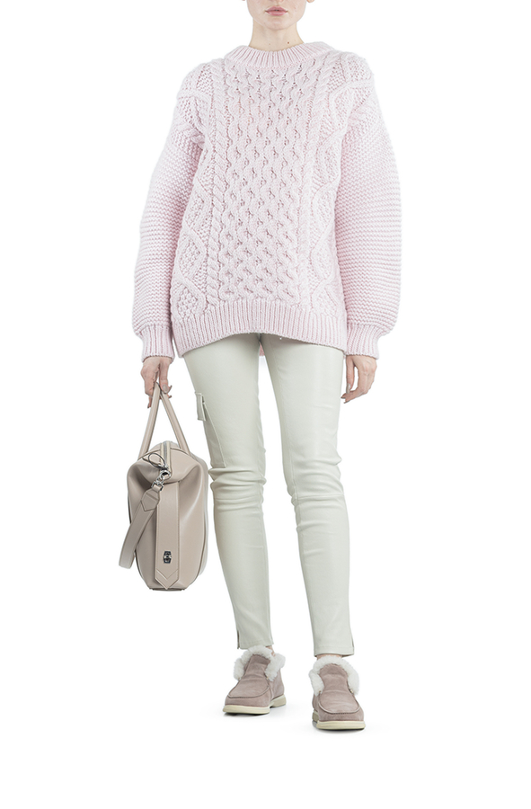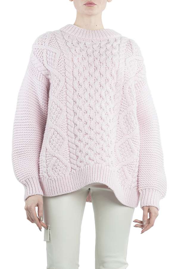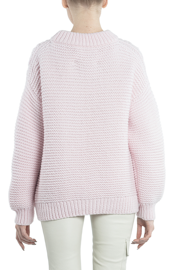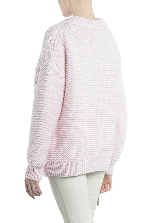 - Светр вільного крою з довгими рукавами і круглим вирізом горловини. Ажурне плетіння спереду, спущена лінія плечей.