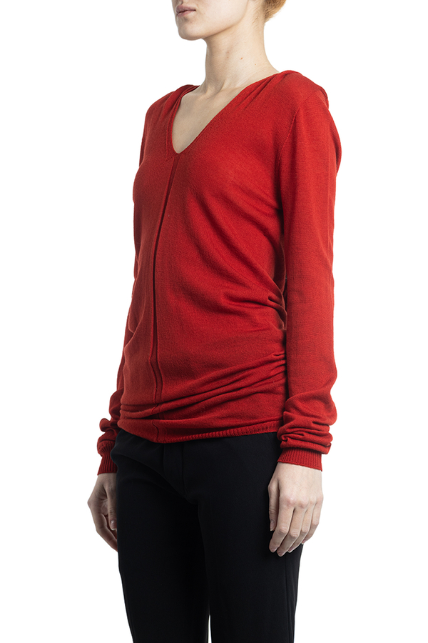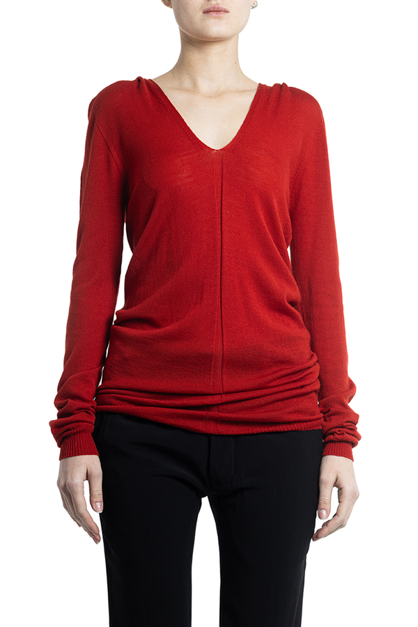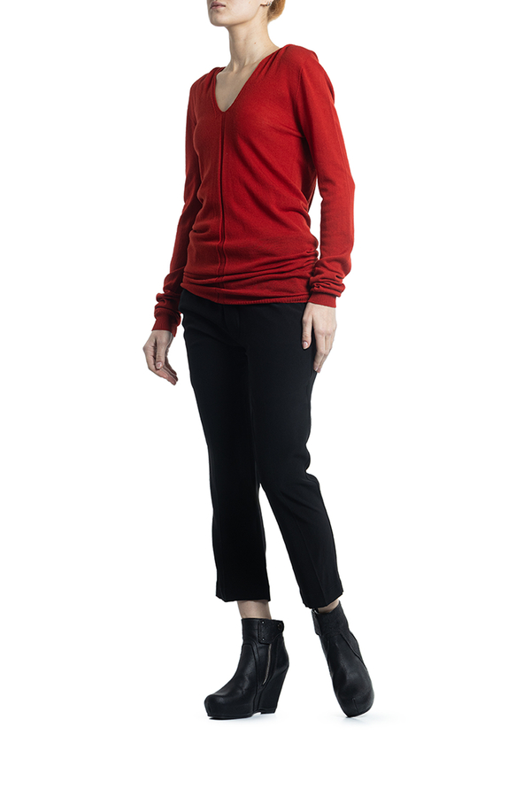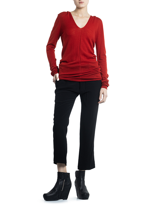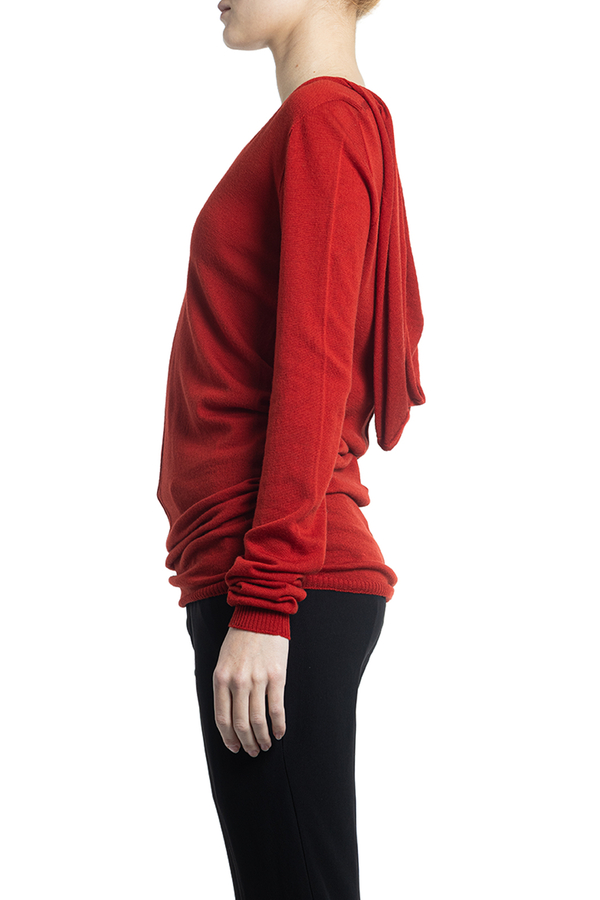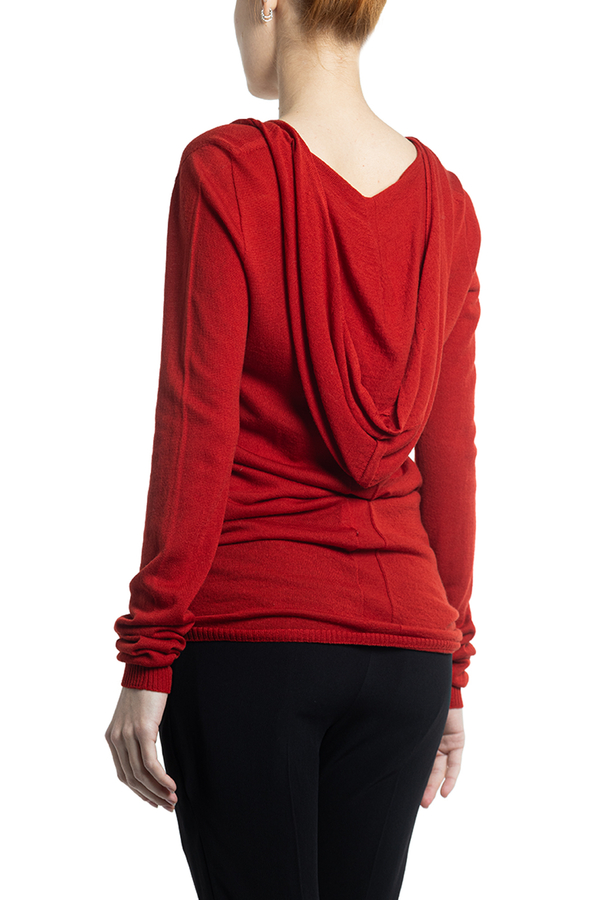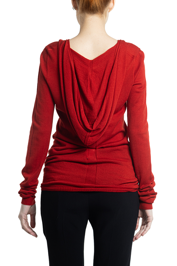 - Светр з капюшоном із вовни. Довгі рукава і поділ, V-подібний виріз горловини, куліска в капюшоні.