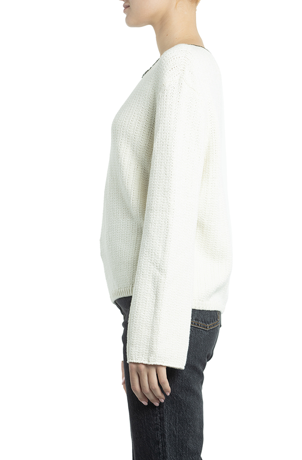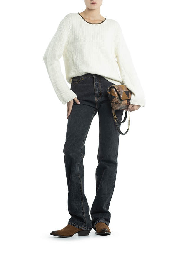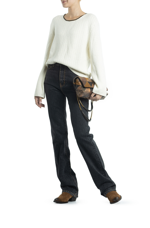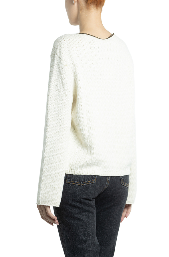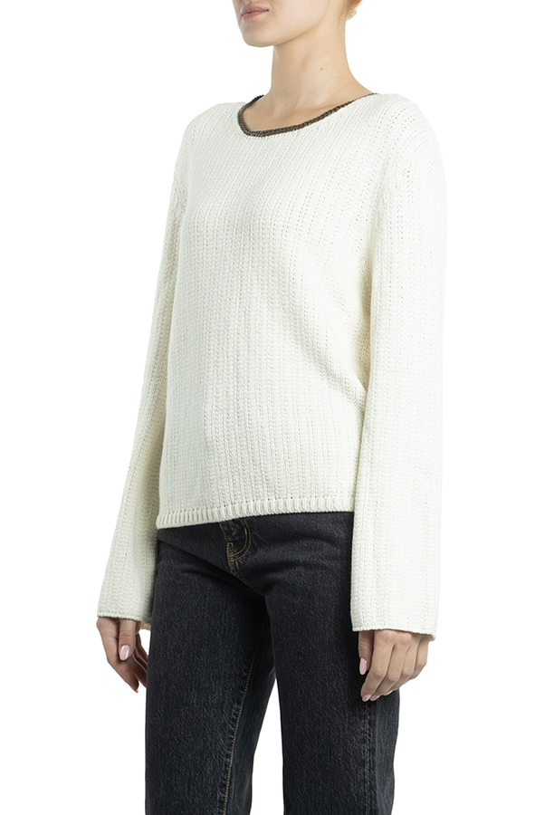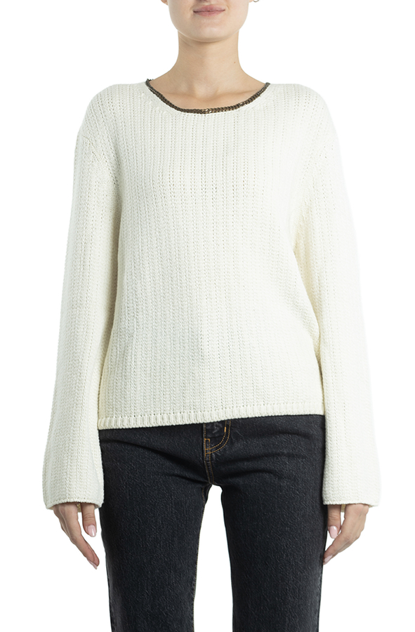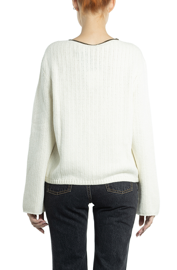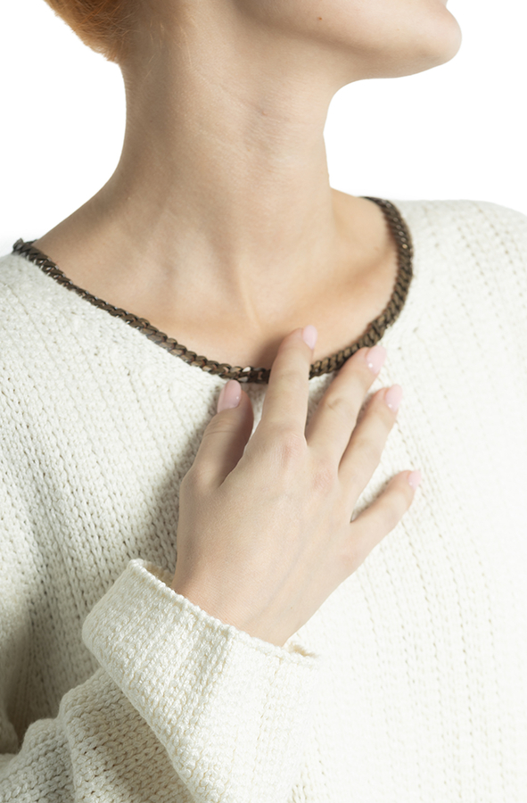 - Светр прикрашений ланцюжком на горловині, з довгими рукавами. Круглий виріз, довгі рукава,вузький крій.