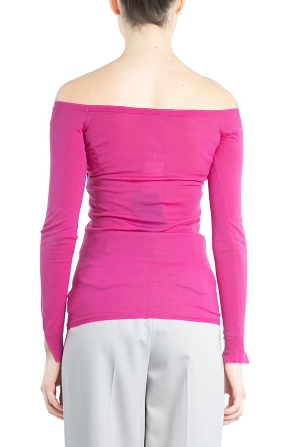 - Светр з глубоким вирізом горловини. Довгі рукави, вузький крій та модель зі спущеними плечима.