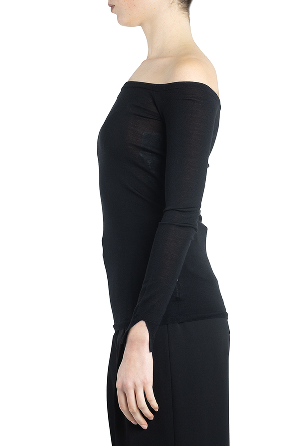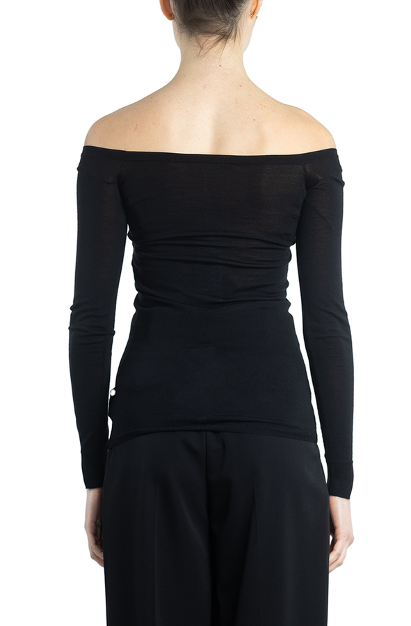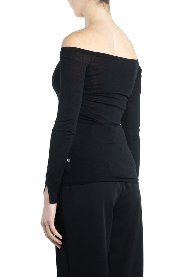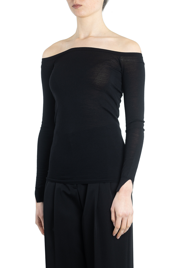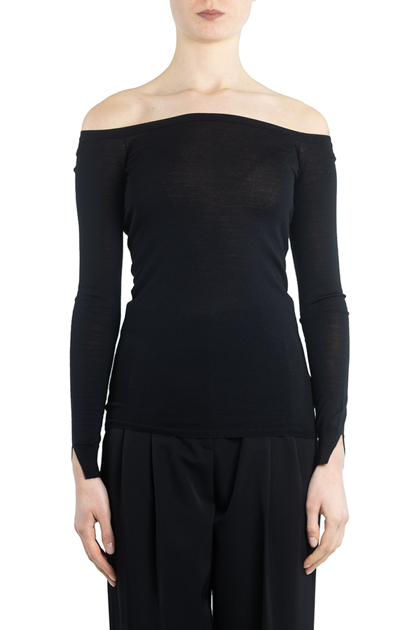- Светр з глубоким вирізом горловини. Довгі рукави, вузький крій та модель зі спущеними плечима.