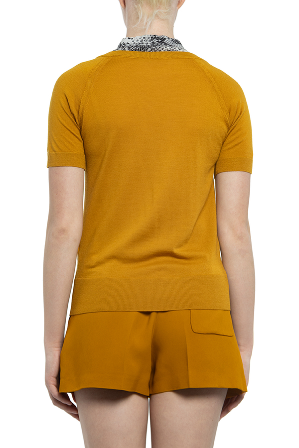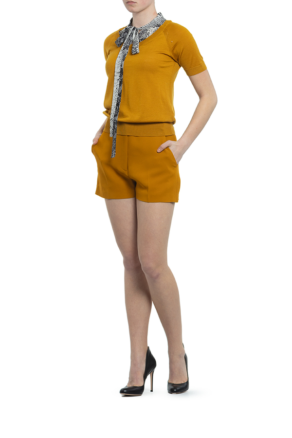 - Светр з короткими рукавами з вовни. Біля горла шовковий бант з принтом пітона.