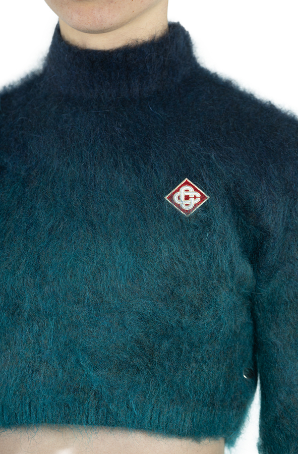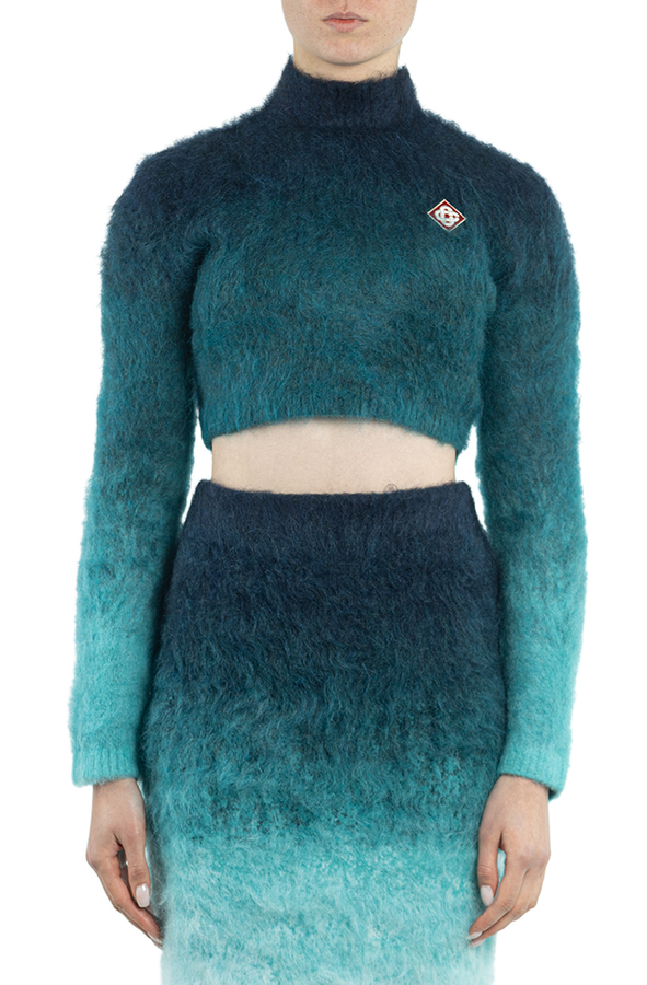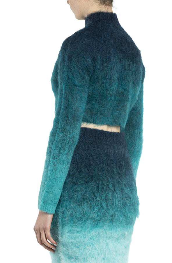 - Короткий светр з довгими рукавами, висока горловина, градієнтні відтінки кольорів, логотип на грудях