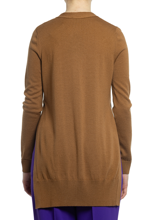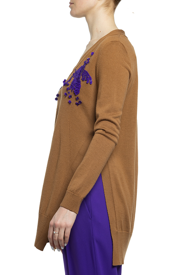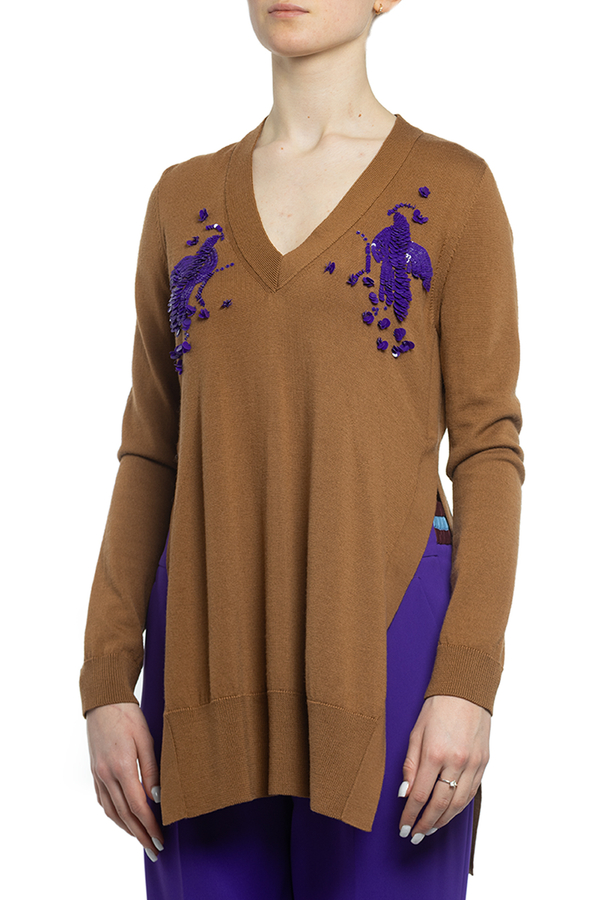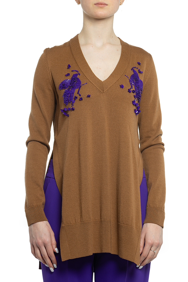 - Светр з V-подібним вирізом горловини з аплікацією птахів спереду. Оздоблення з паєток.