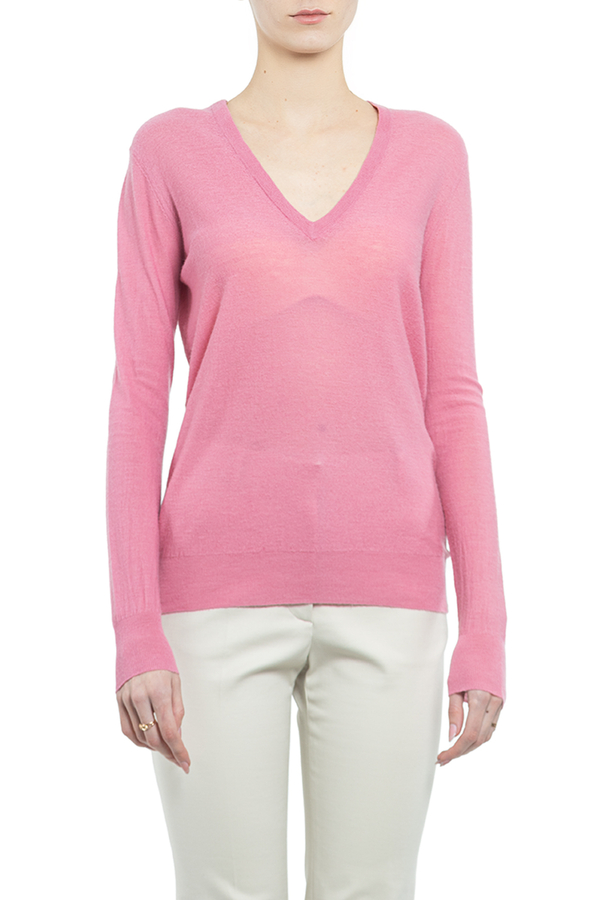 - Тонкий джемпер з довгими рукавами і V-подібним вирізом горловини.