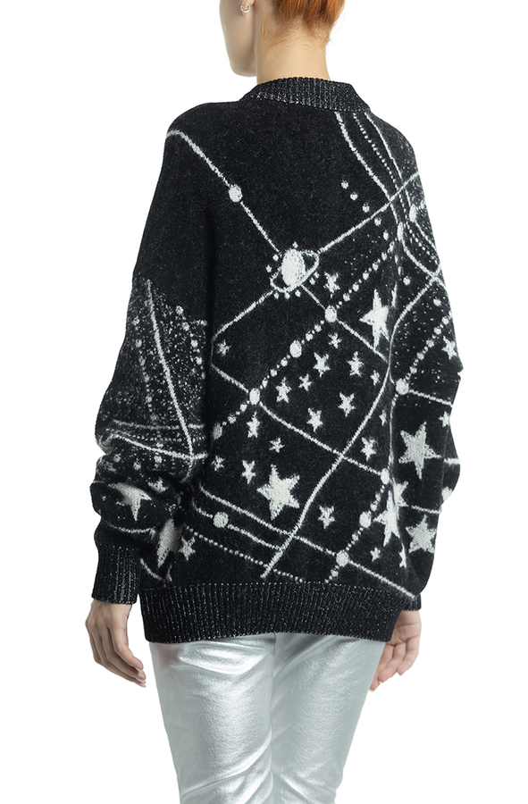 - Светр з зображенням космосу, зірок і оздобленням люрексом. Довгий подол і рукава.