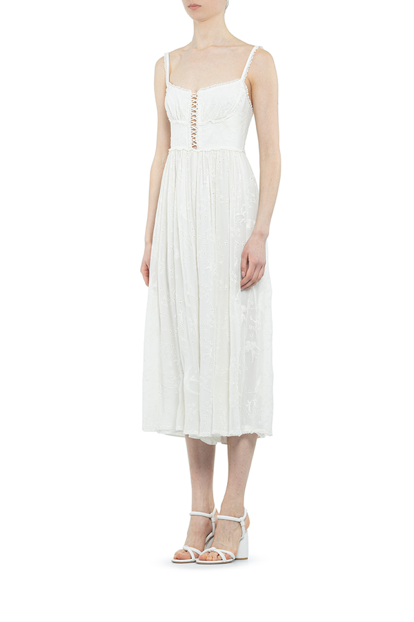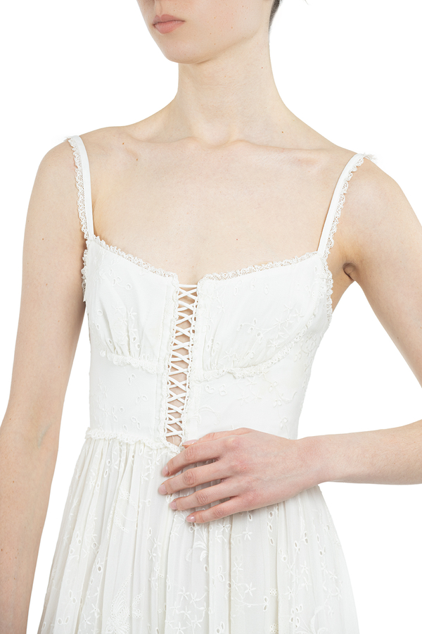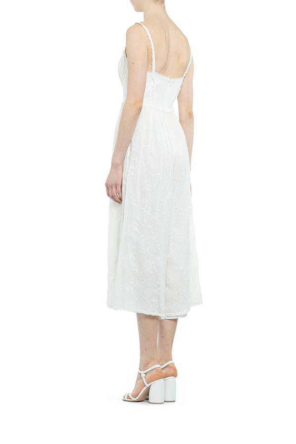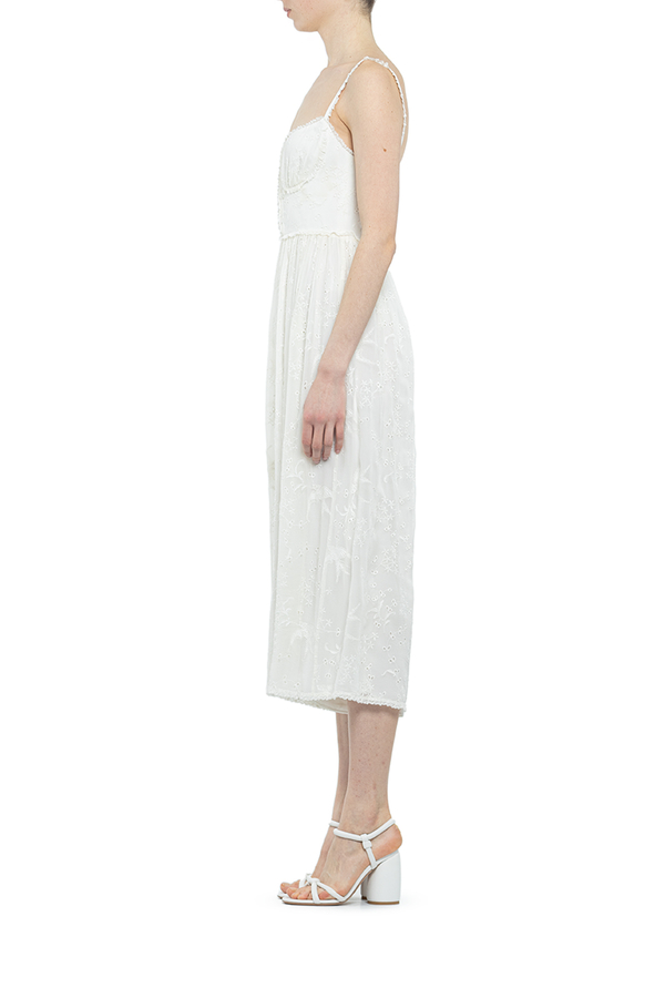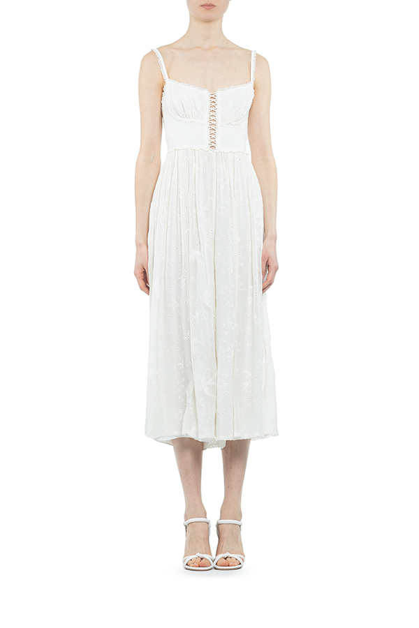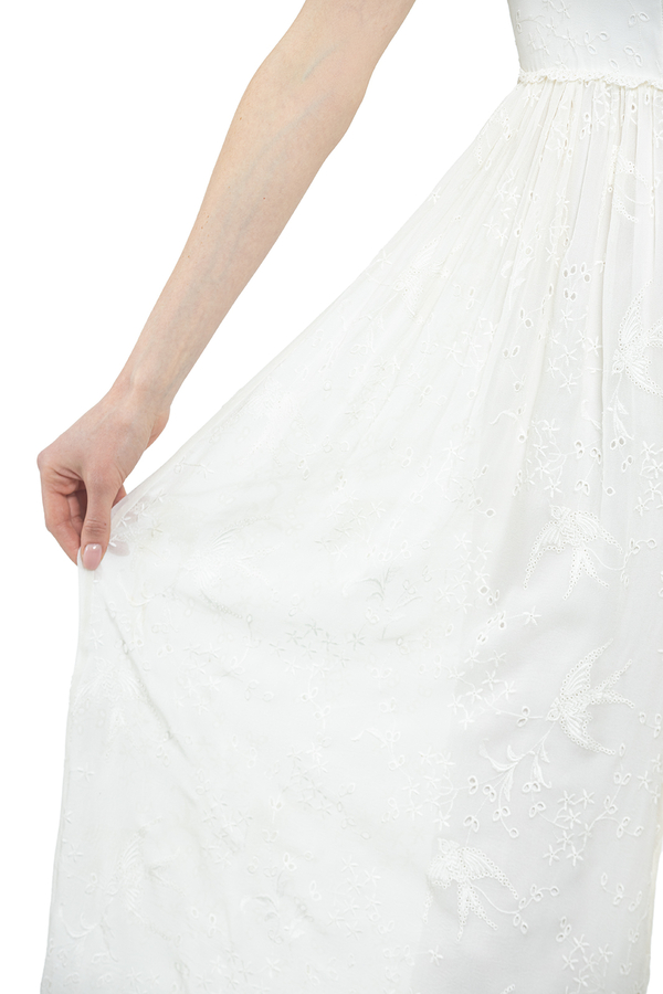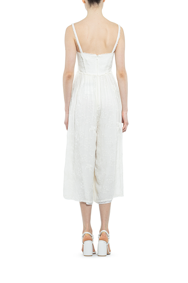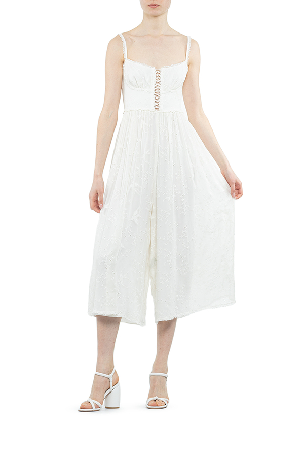 - Шовковий брючний комбінезон декорований вишивкою з квітами. Відкритий верх на брителях, прихована блискавка ззаду, вибиті деталі. Прикраса з шнурівкою спереду та плісірована талія на еластичній стрічці.