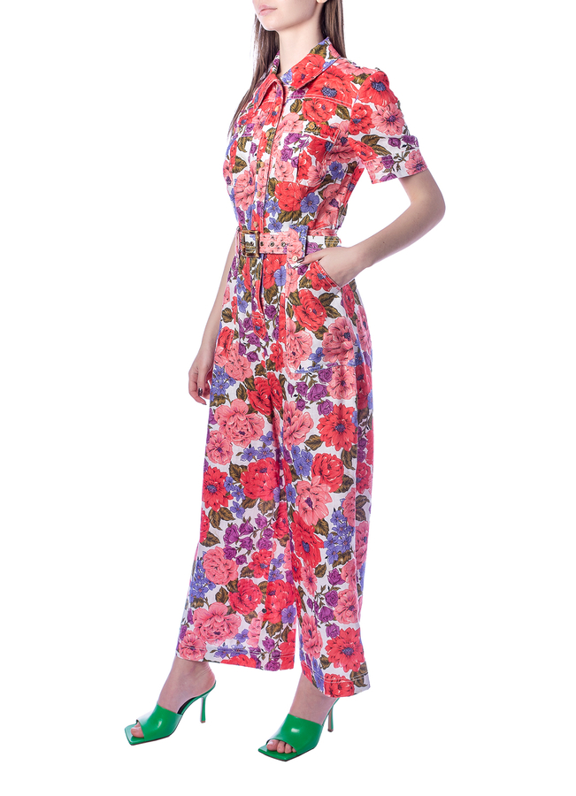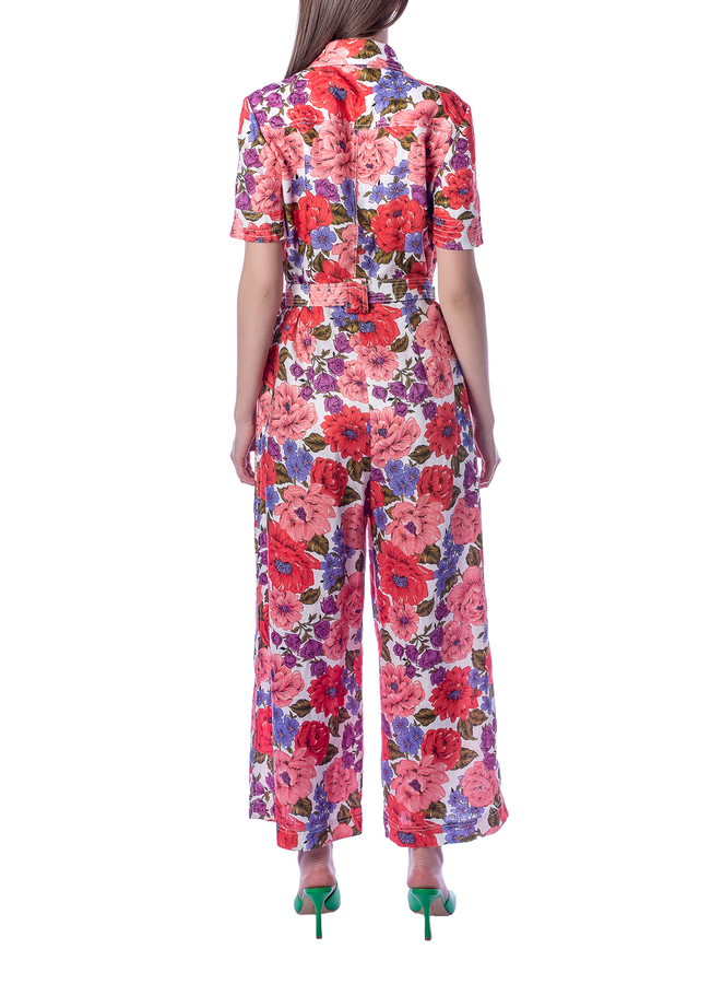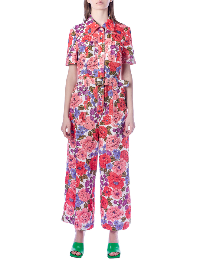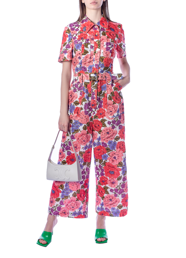 - Комбинезон длинный, короткий рукав, два накладных кармана на груди, съемный ремень, цветочный принт