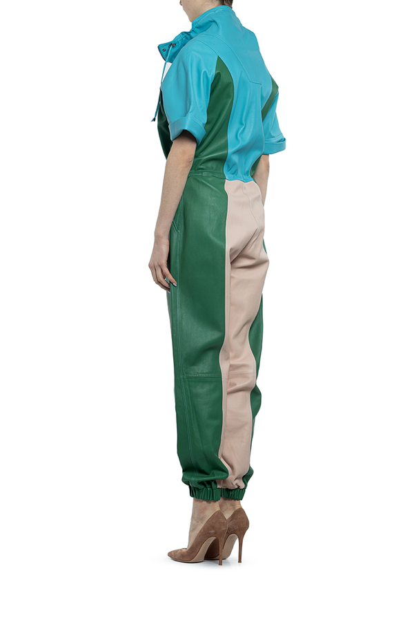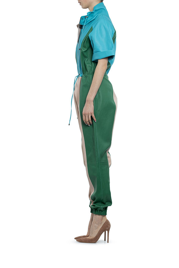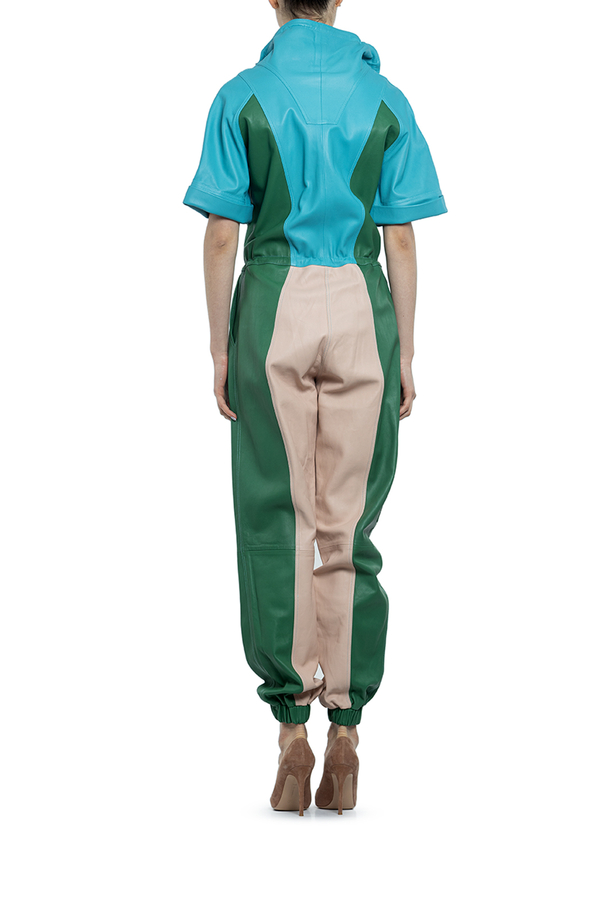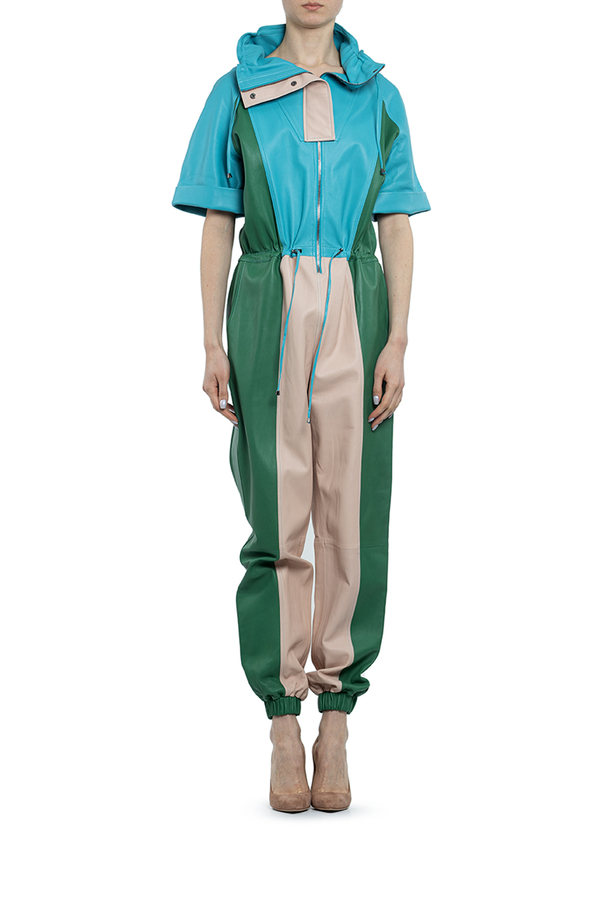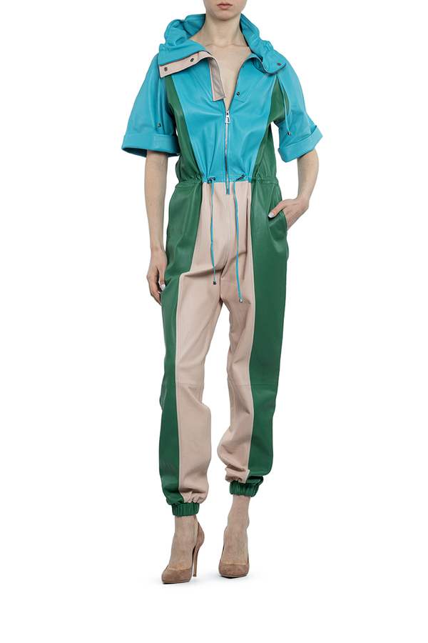 - Брючний шкіряний комбінезон, короткі рукава з манжетами, високий комір, пояс на кулісі, низ штанів на резинці