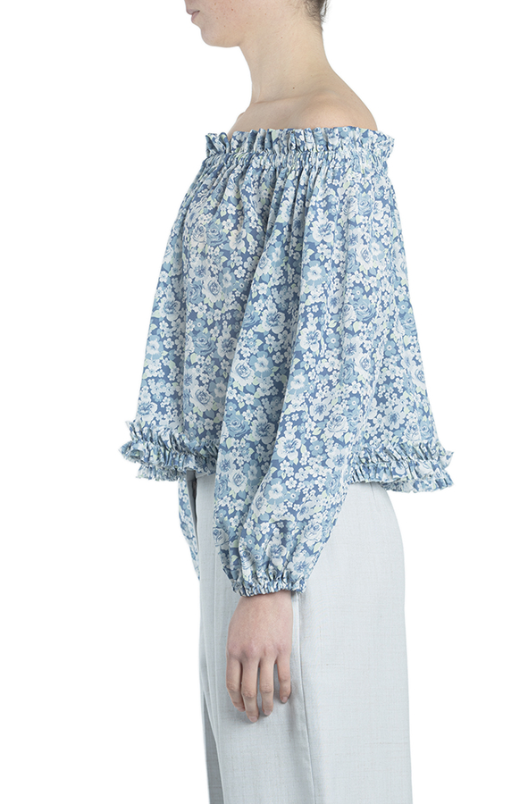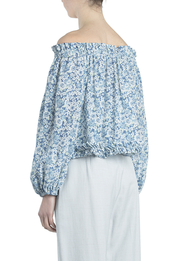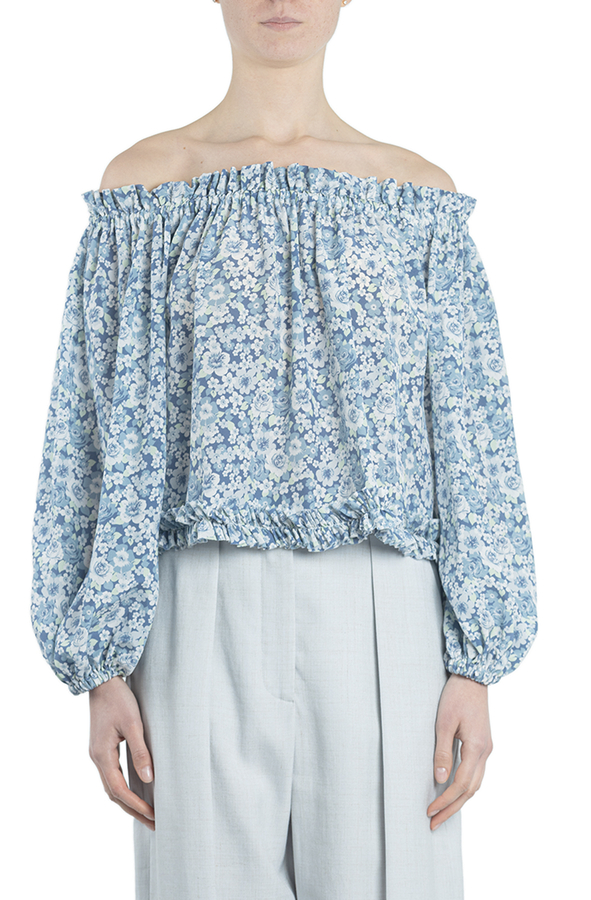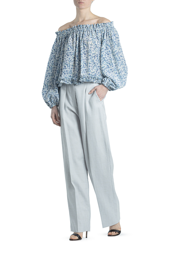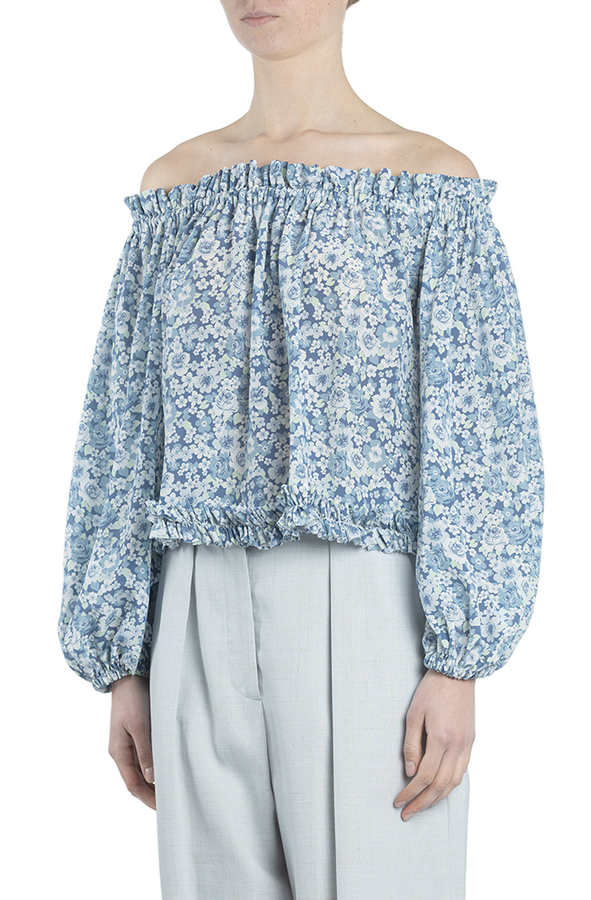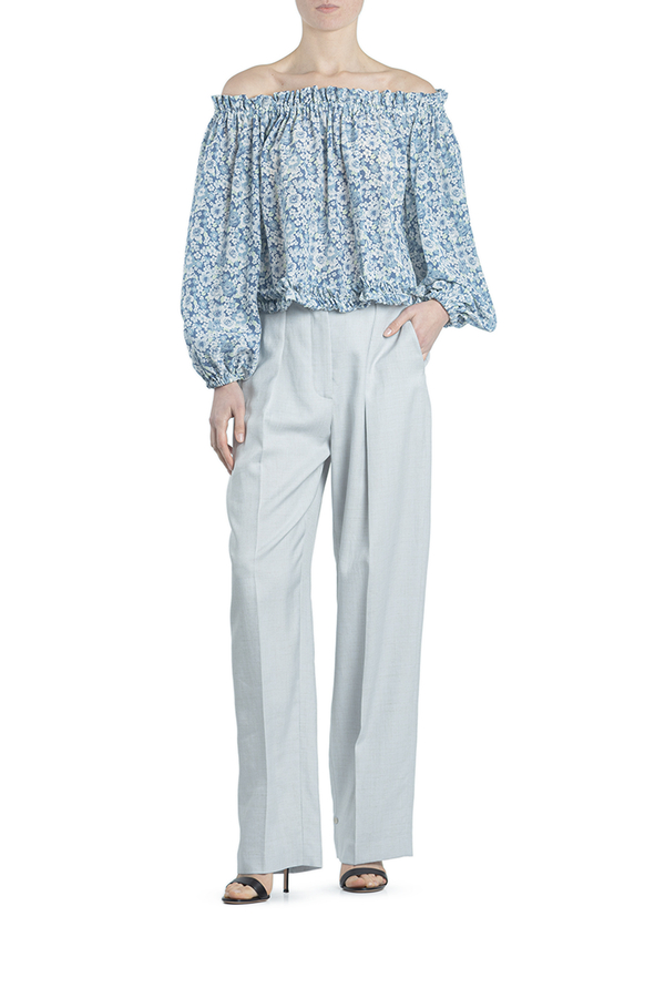 - Шовкова блуза вільного крою з принтом в квіточку. Прикрашена зібраним коміром і манжетами.