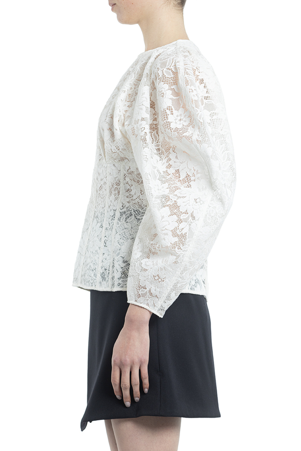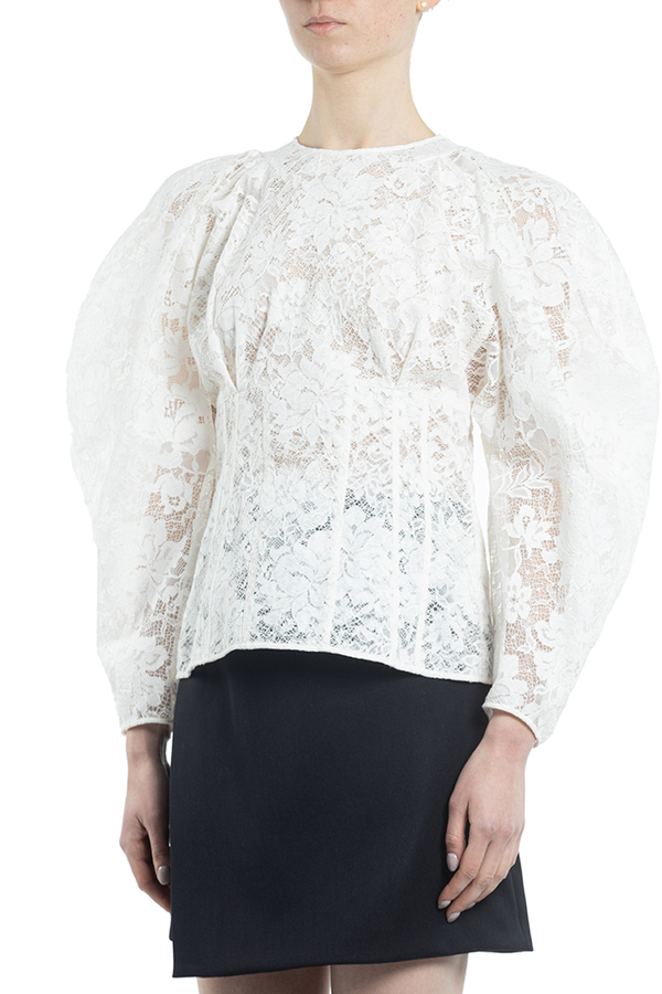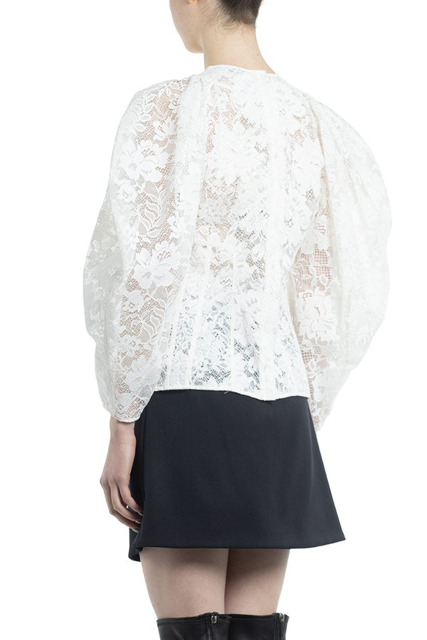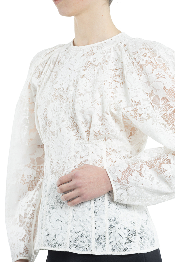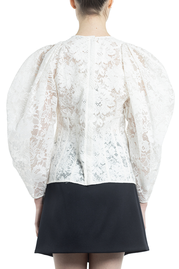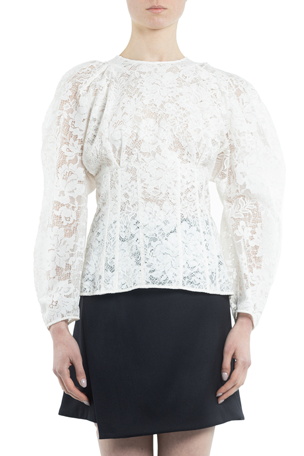 - Гіпюрова блуза с довгими рукавами-баллонами. Застібка на блискавку ззаду. З круглою горловиною, довгими рукавами, квітковим мереживним візерунком.