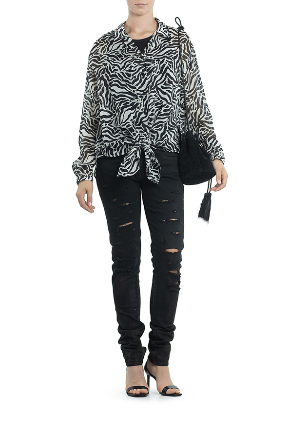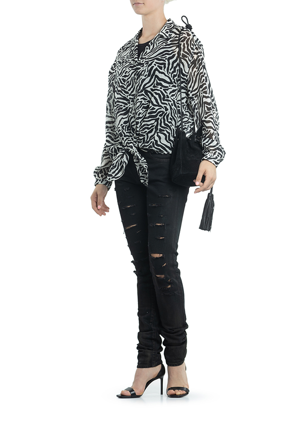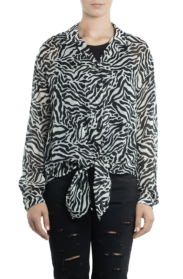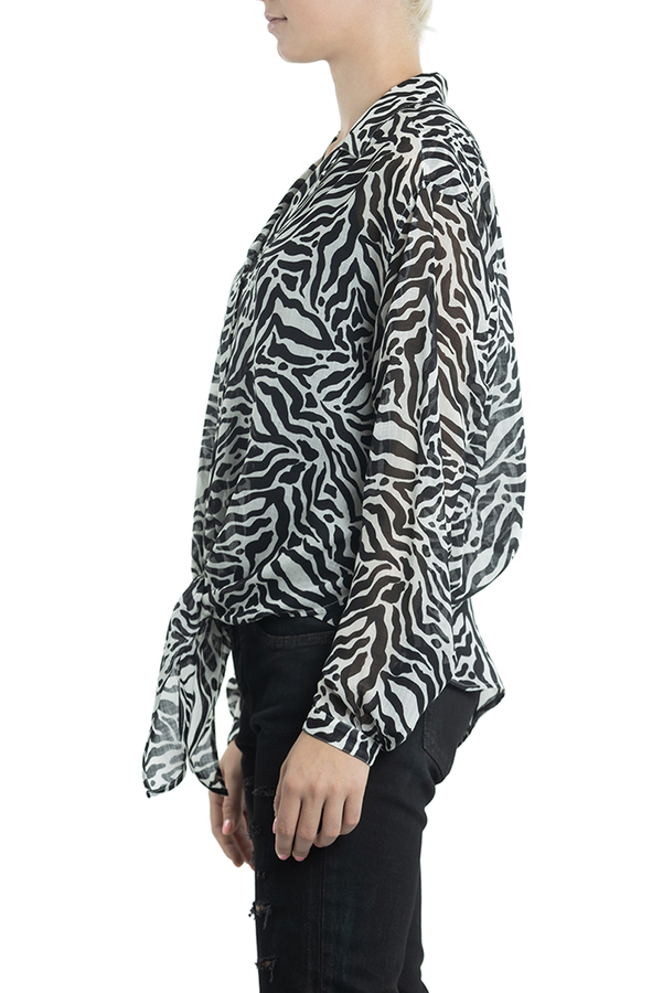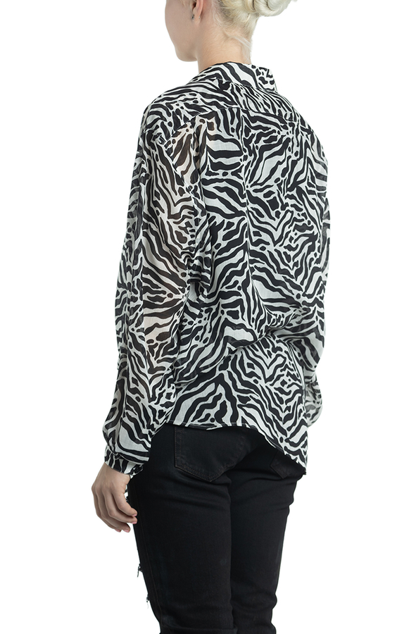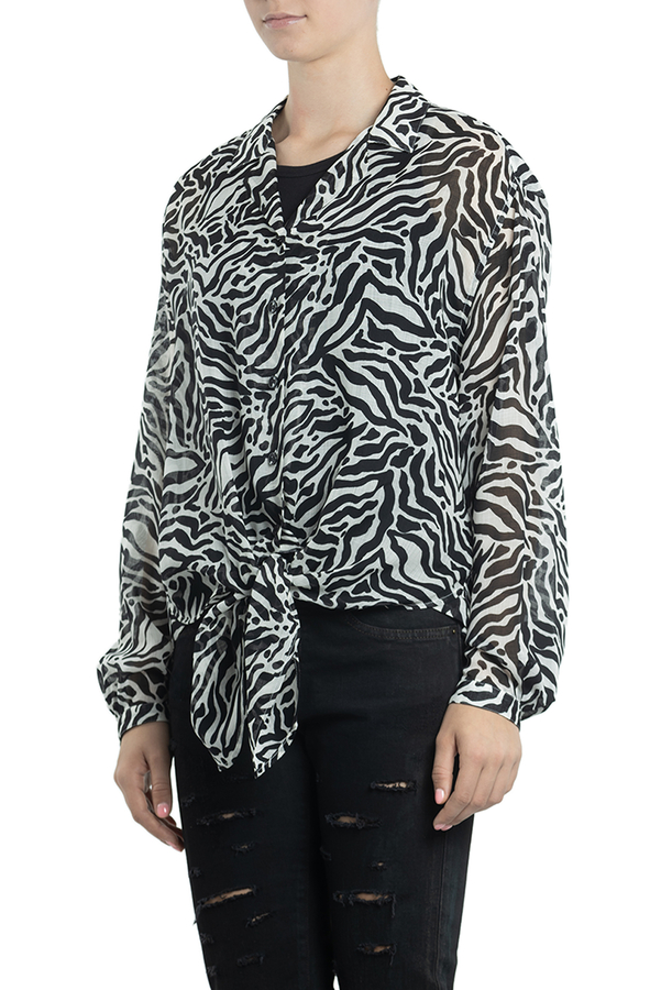 - Сорочка з анімалістичним принтом з зазубреними лацканами, довгими рукавами. Манжети та застібка спереду на ґудзиках. Закруглений поділ.