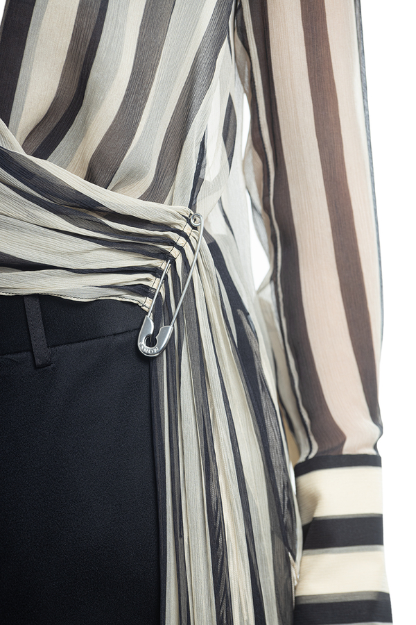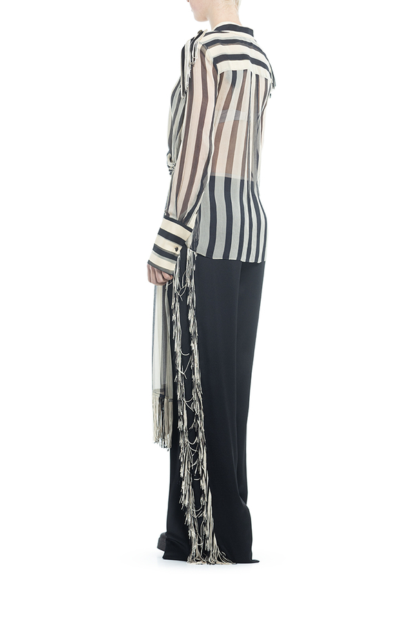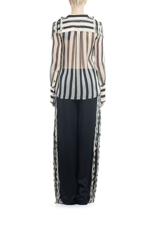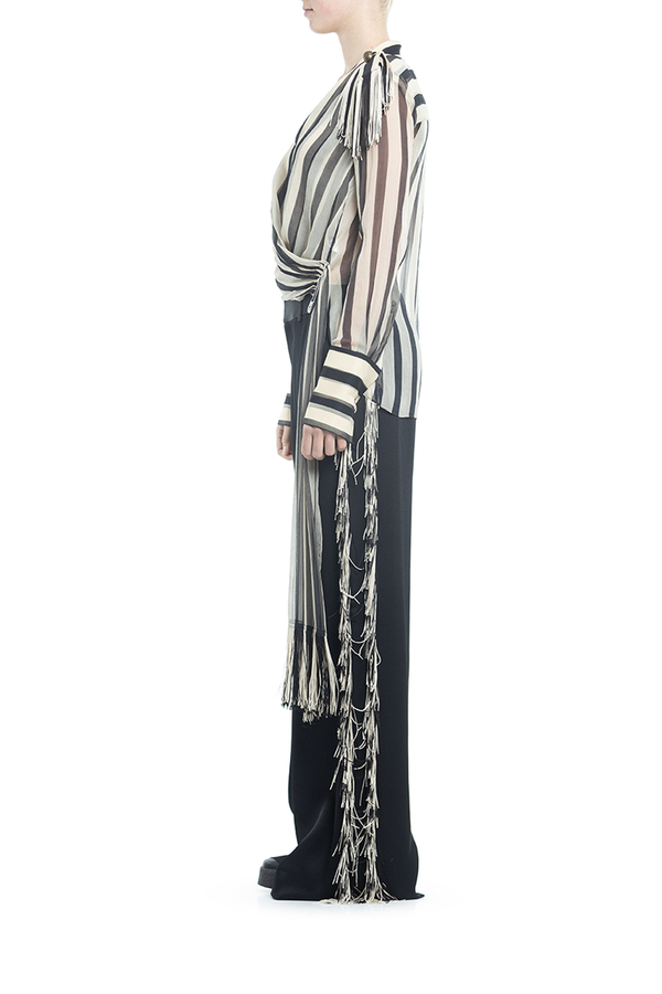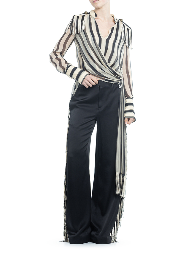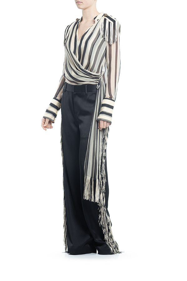 - Смугаста блузка з довгими рукавами із зав'язкою-шарфом. Еполети з бахромою на плечах, перед з перехрещеною тканиною, високі манжети на рукавах.