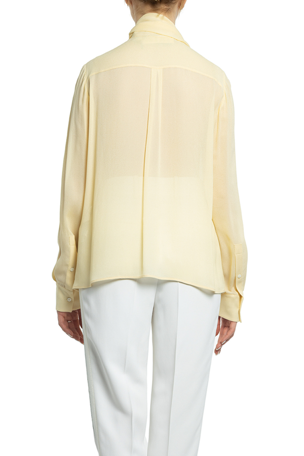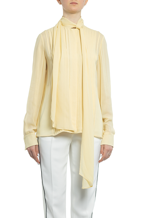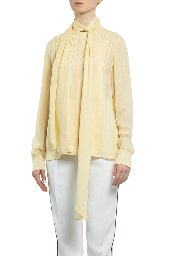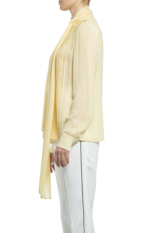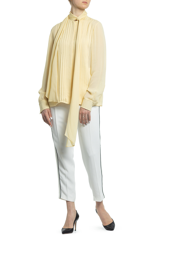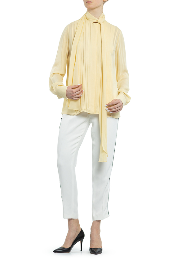 - Блуза з довгими рукавами з дрібними складками. На комірі бант.