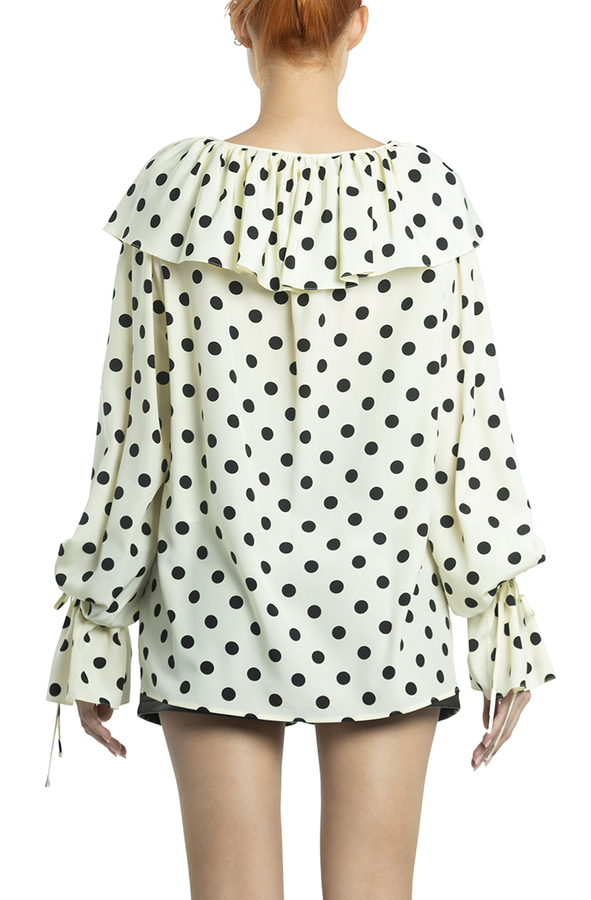 - Блуза у горох з рюшами, довгий рукав, глибокий V-подібний виріз
