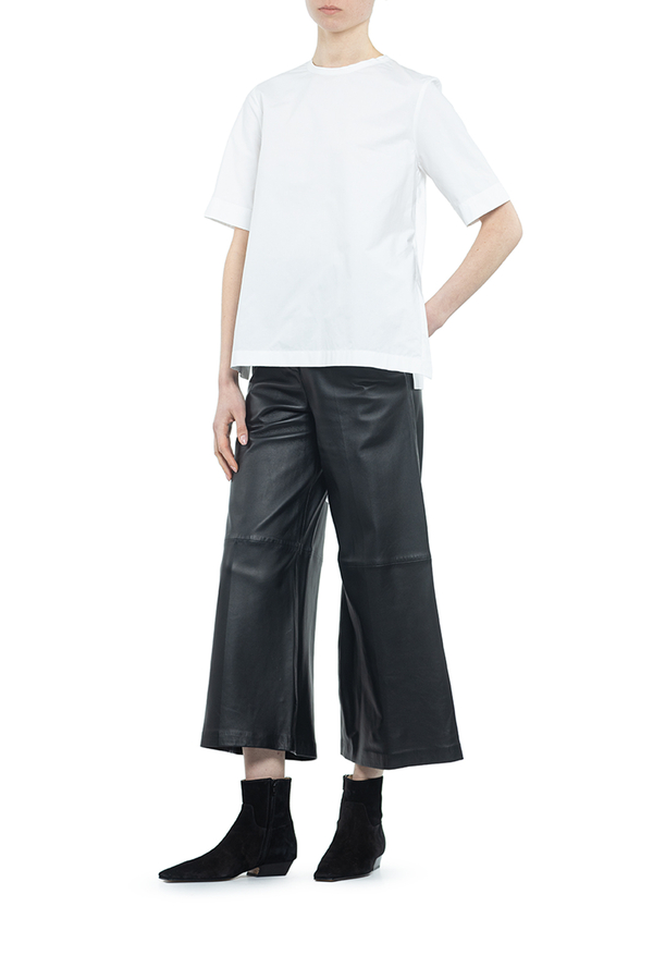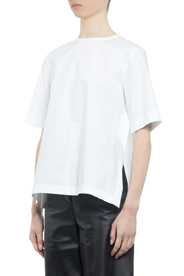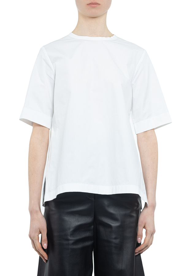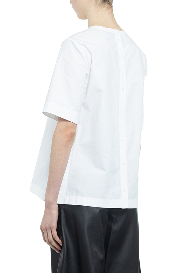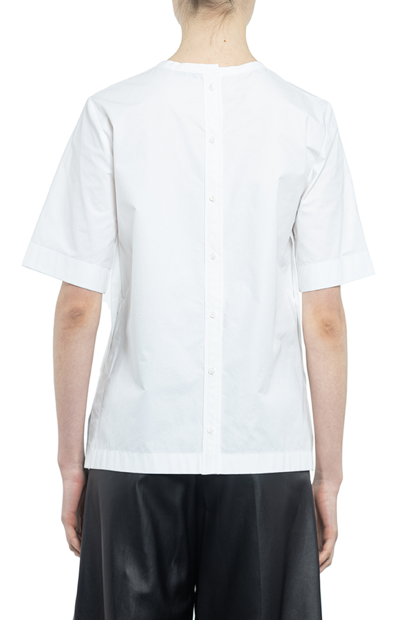 - Бавовняна блуза з короткими рукавами з розрізами з боків. Застібка на спині на гудзиках.