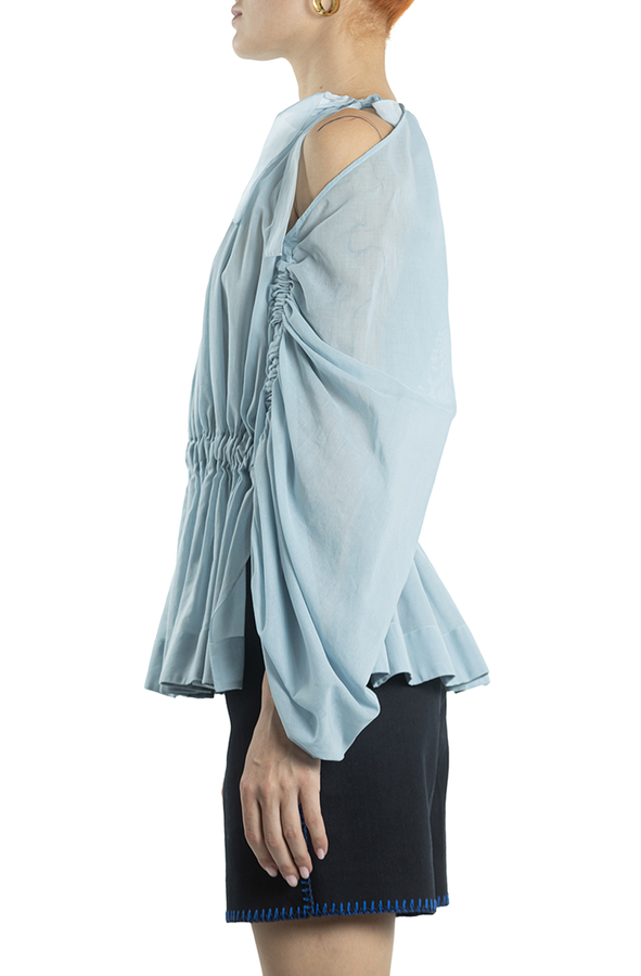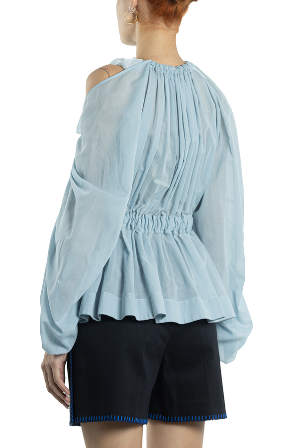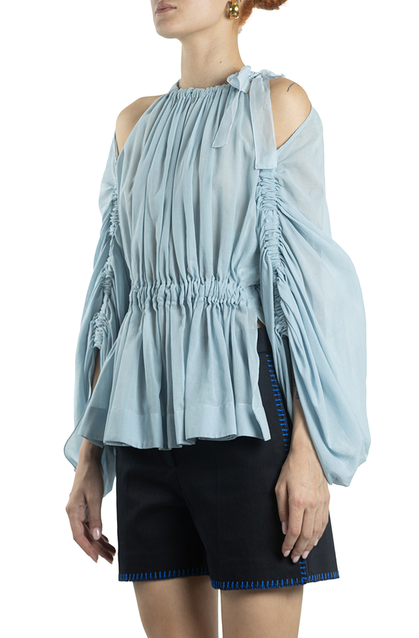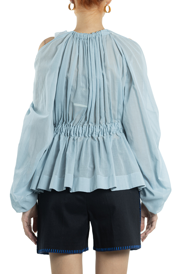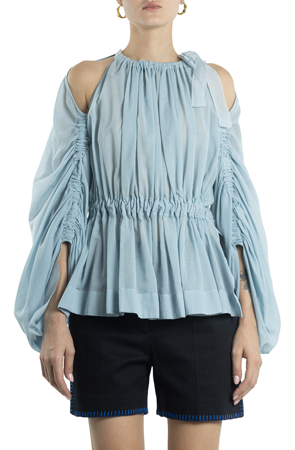 - Бавовняна блуза з довгими рукавами з еластичним поясом на талії. Дизайн з відкритими плечіма.