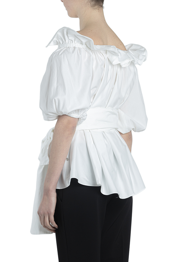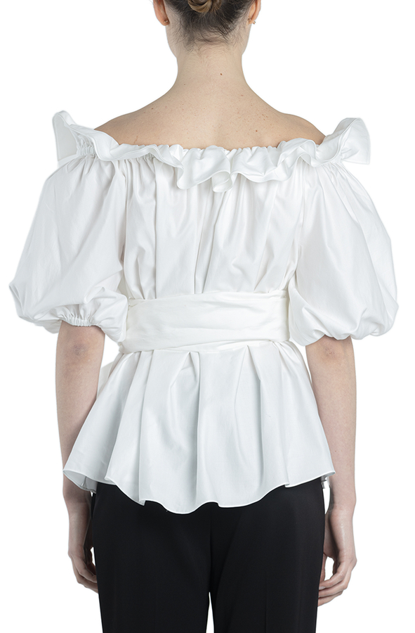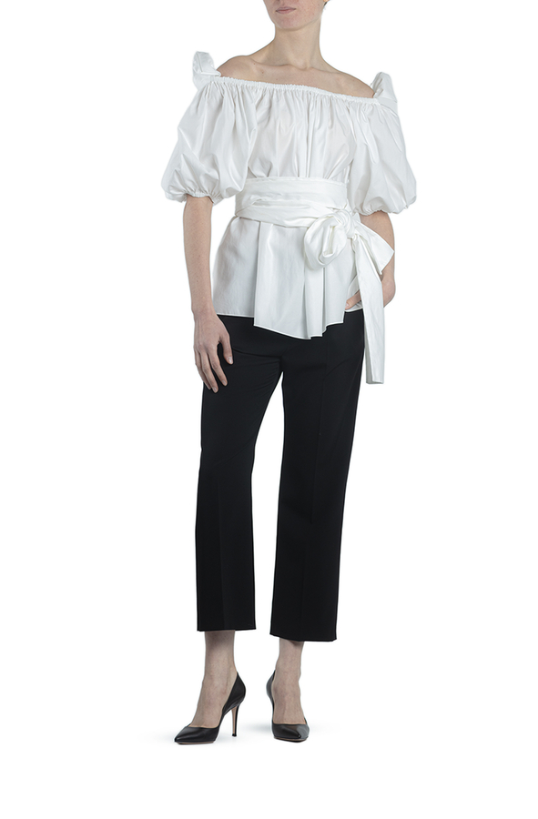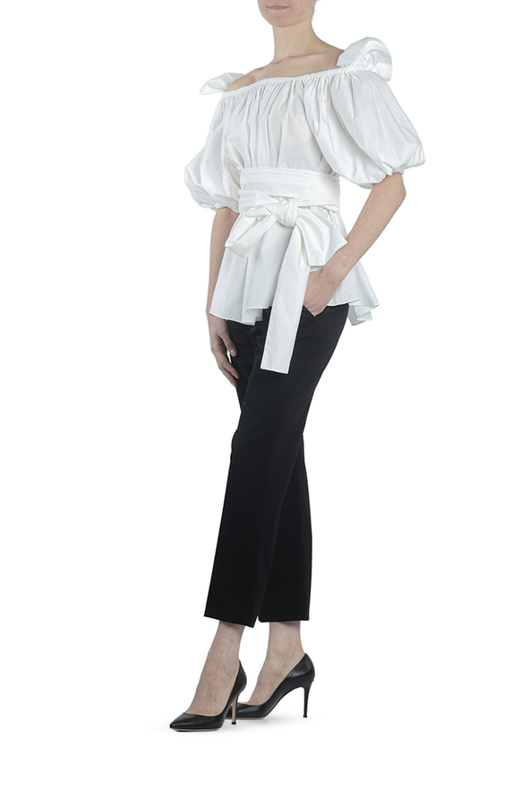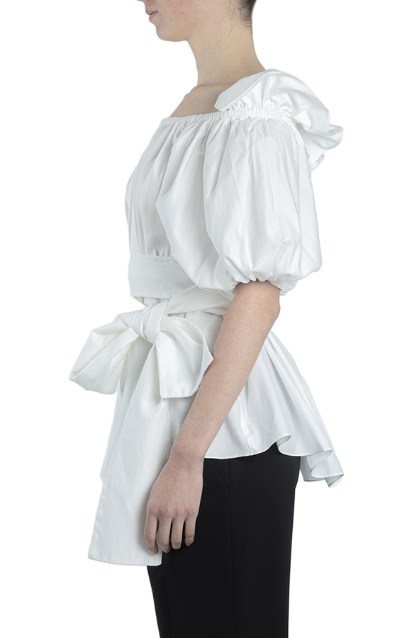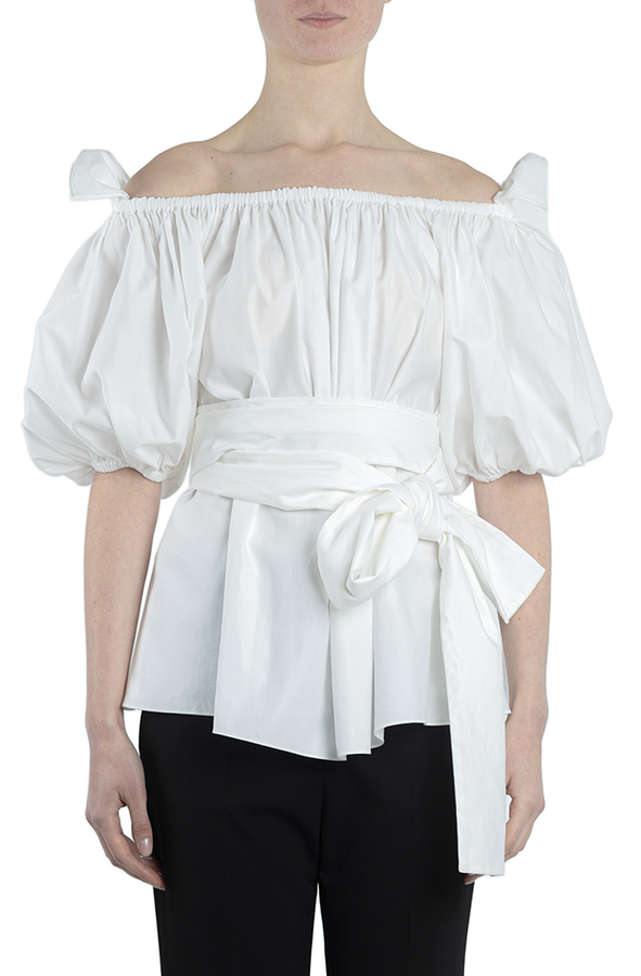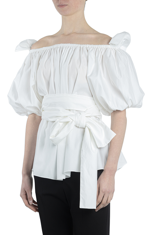 - Бавовняна блуза з рукавами три чверті. Оздоблена довгим бантом зав'язаним на талії. Відкриті плечі, пишні рукави, об'ємний дизайн.