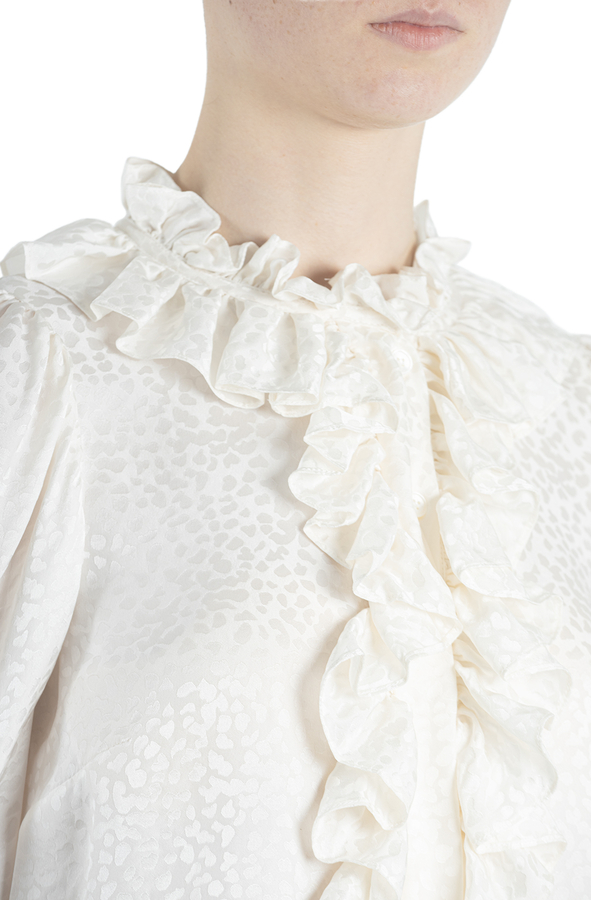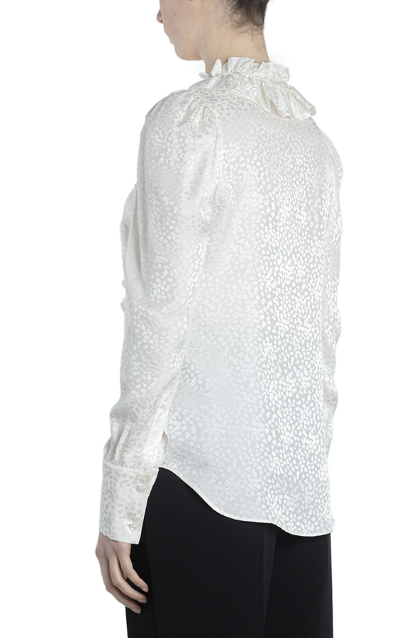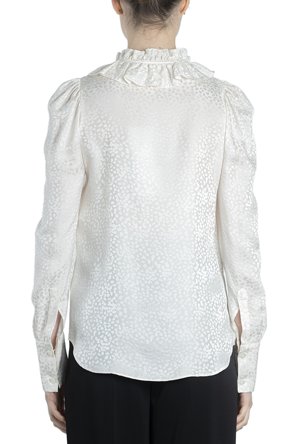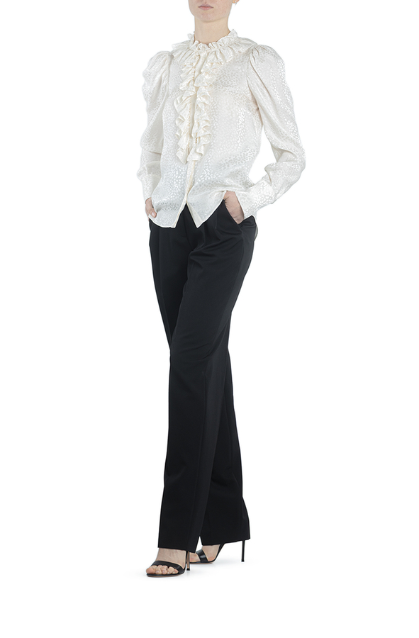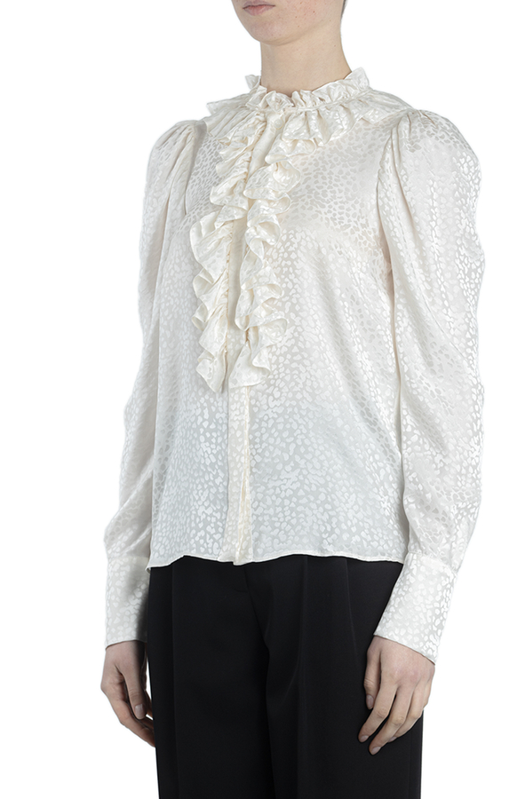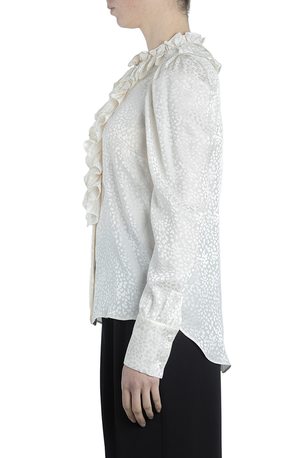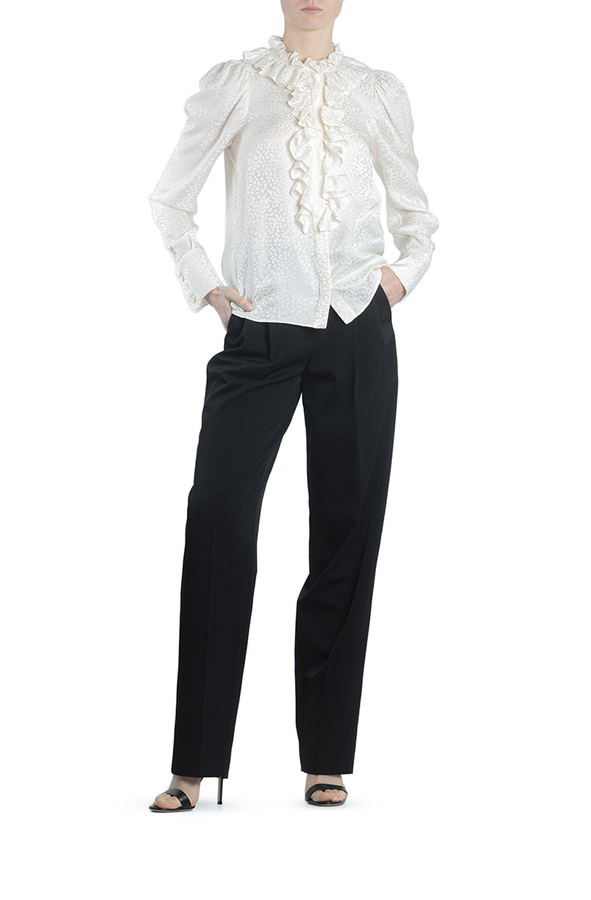 - Шовкова блуза з довгими рукавами. Комір оздоблений рюшами жабо.