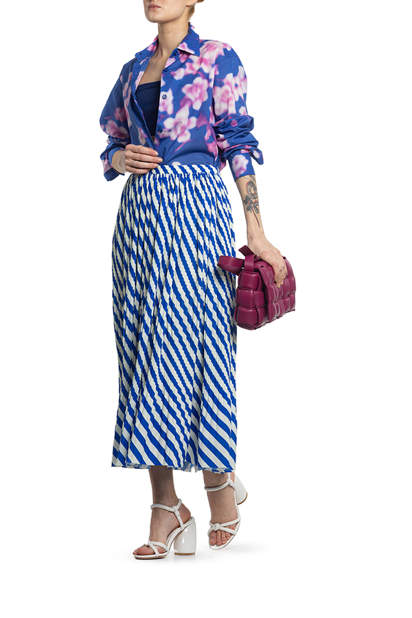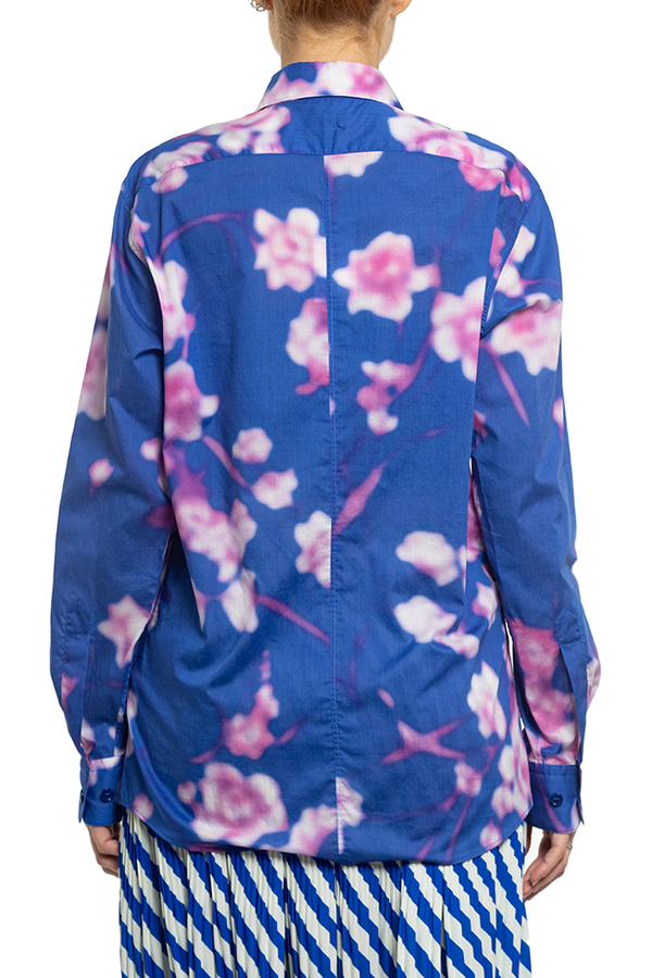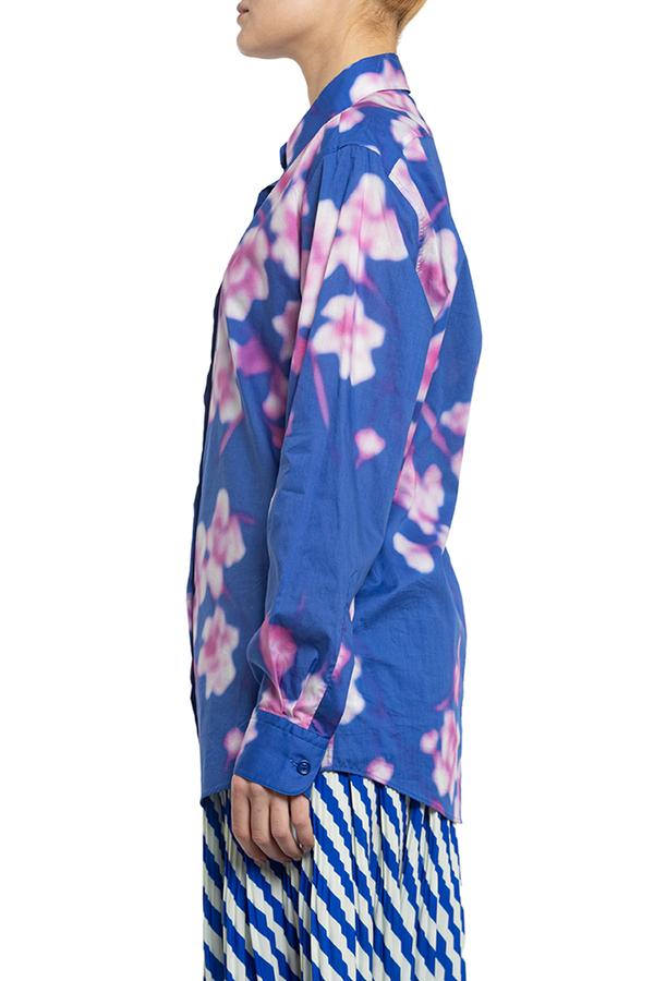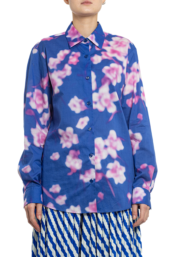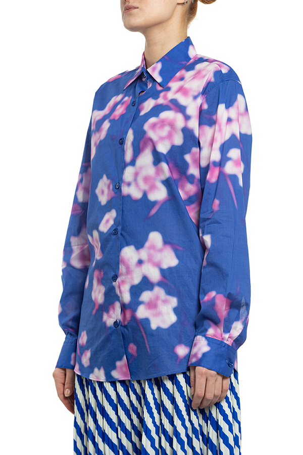 - Сорочка з довгими рукавами і вигнутим подолом. Класичний комір, манжети на подвійних ґудзиках, квітковий візерунок по всій поверхні.