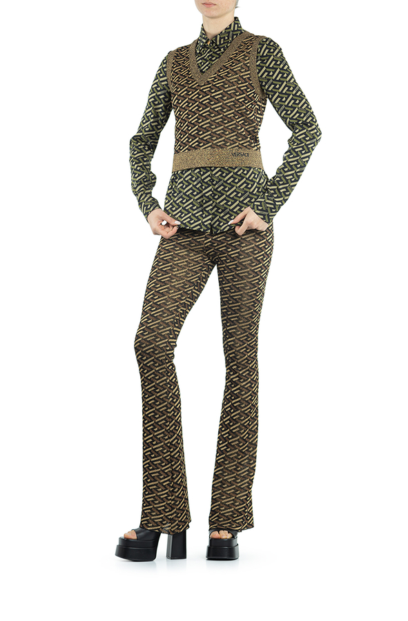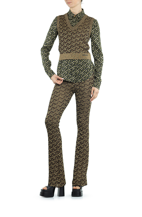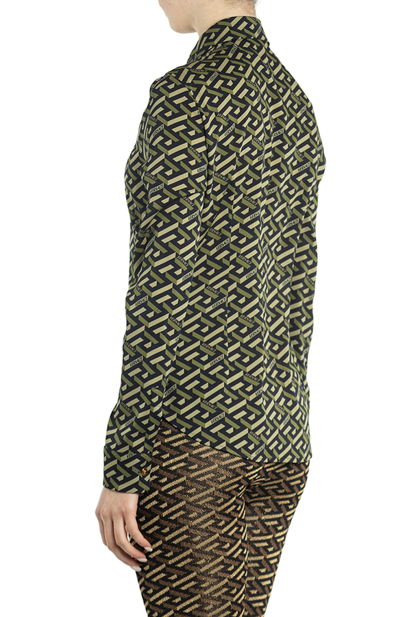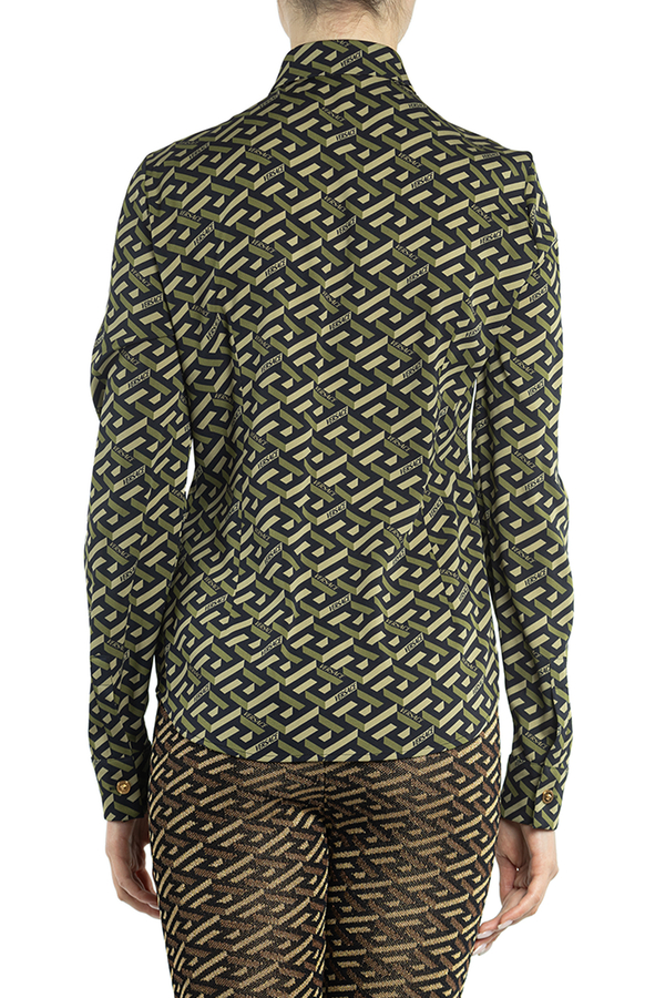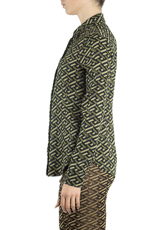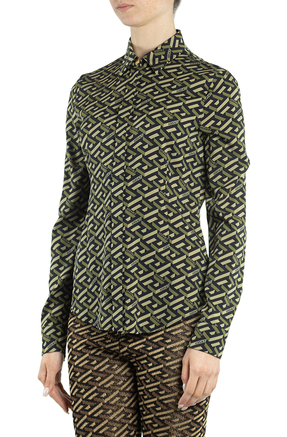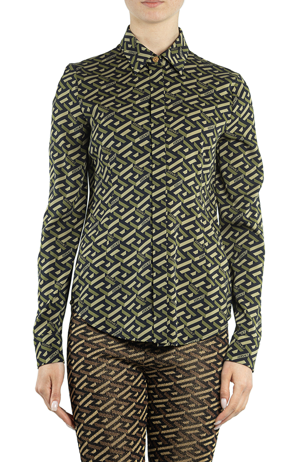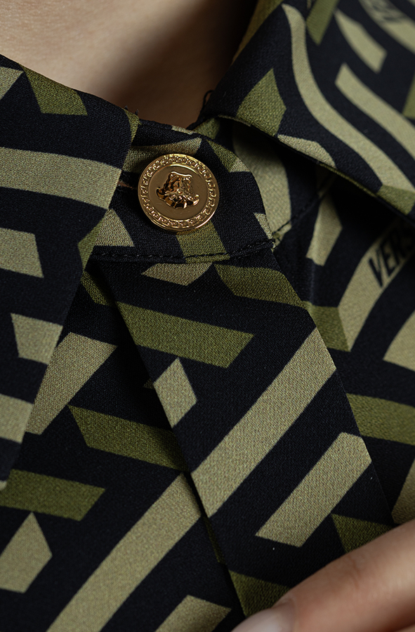 - Класична сорочка на прихованих ґудзиках з еластичного шовку, прикрашена геометричним принтом і має облягаючий силует.