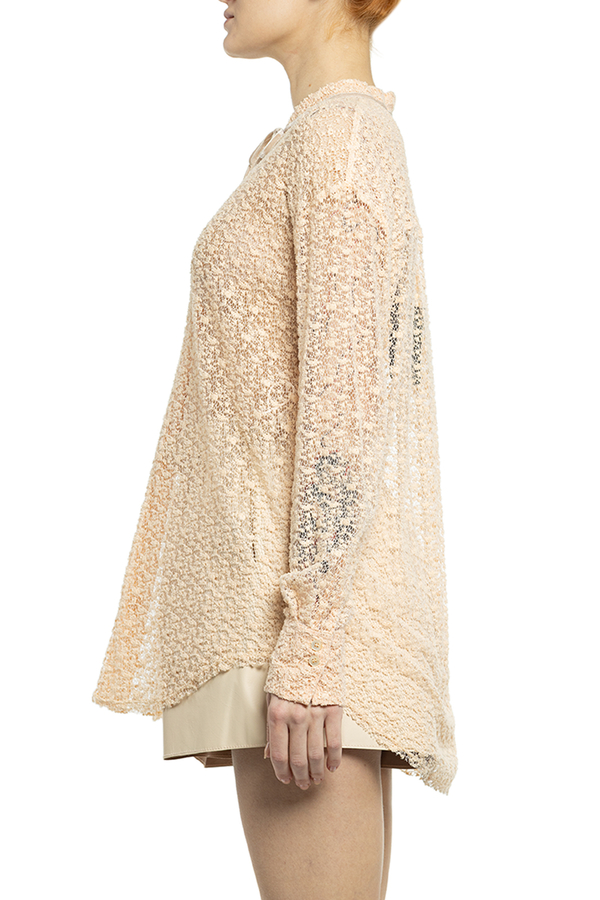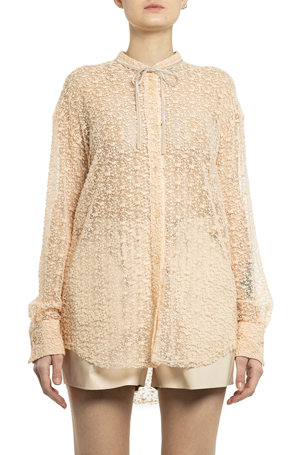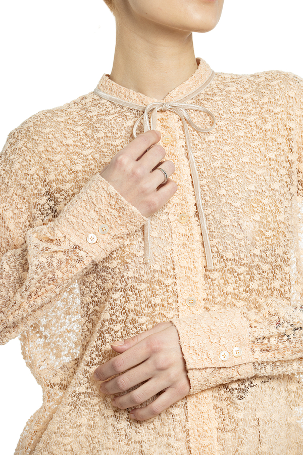- Напівпрозора блуза з мереживної тканини, з довгими рукавами. Комір-стійка з оксамитовою стрічкою для зав'язування за бажанням. Застібка на гудзики.