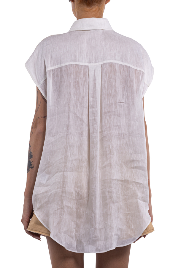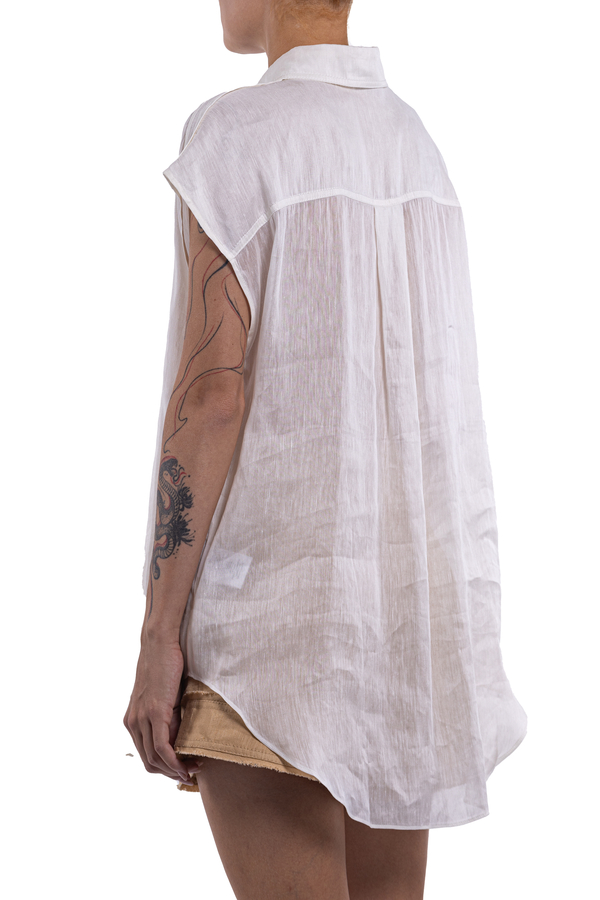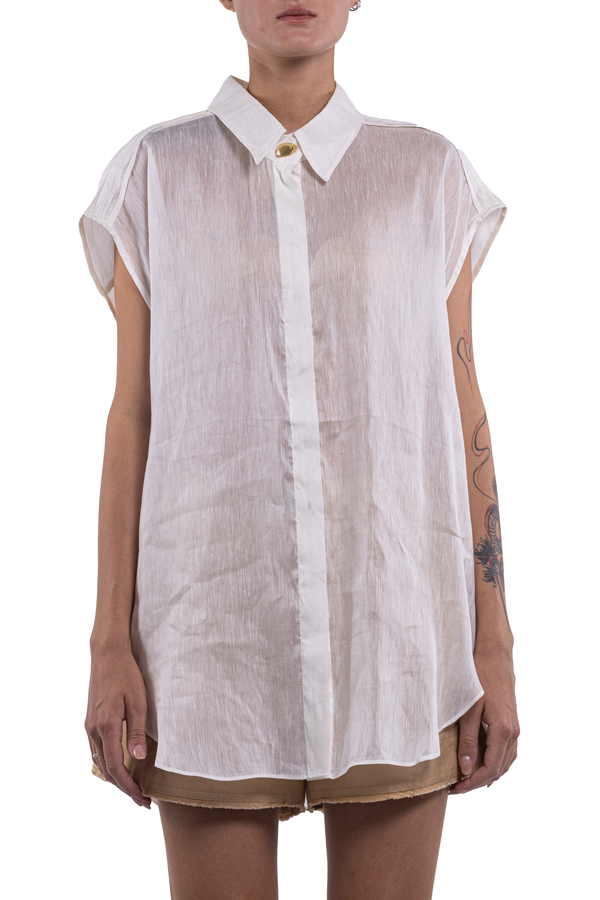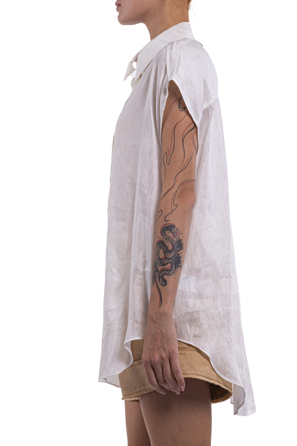 - Рубашка без рукавов, полупрозрачная конструкция, классический воротник, застежка на скрытые пуговицы спереди, изогнутый низ
