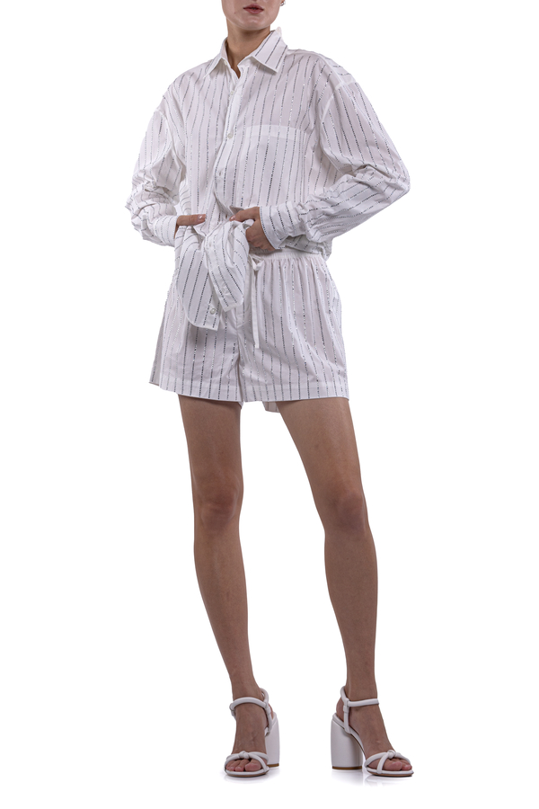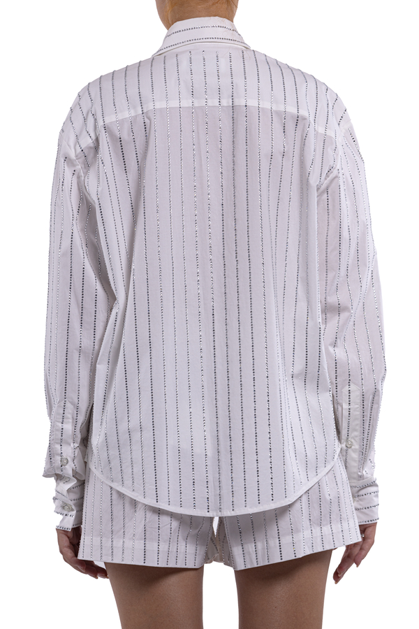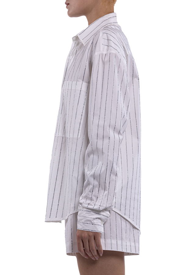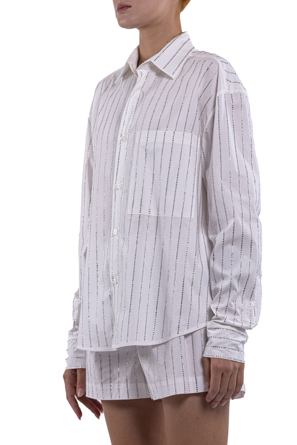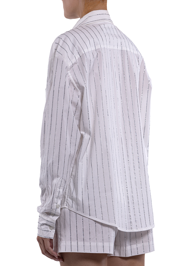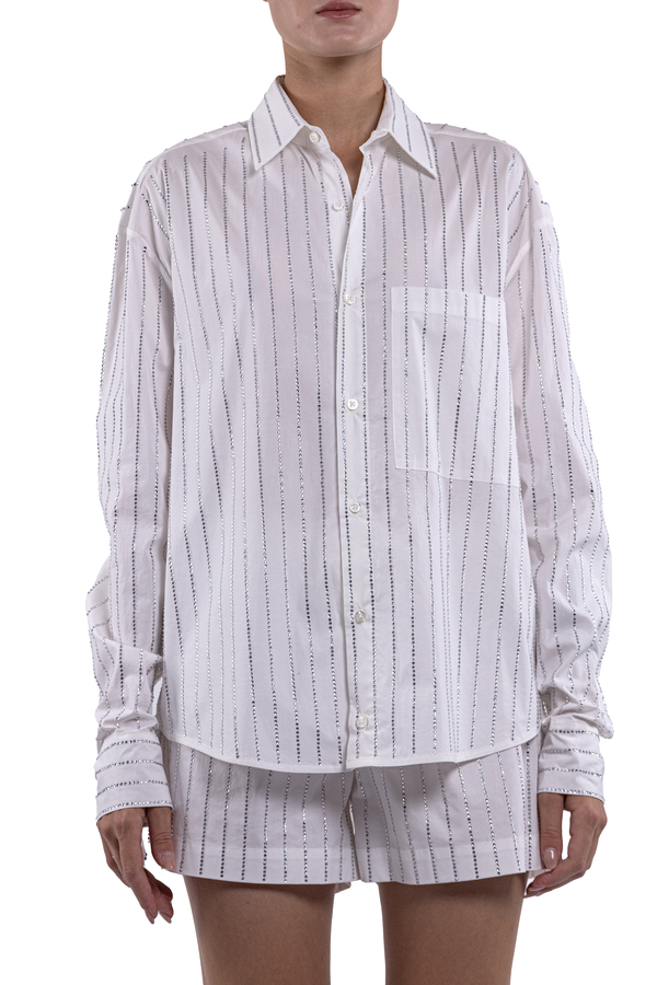 - Рубашка с длинными рукавами, украшенная кристаллами, классический воротник, фигурный низ, нагрудный накладной карман, манжеты и передняя планка на пуговицах.