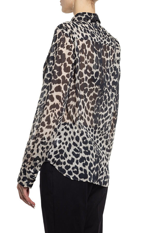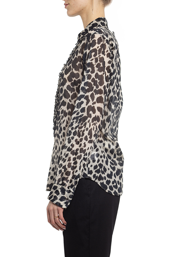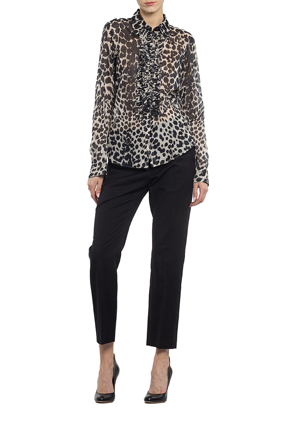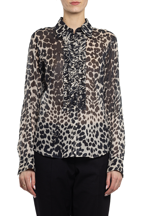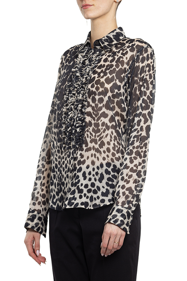 - Бавовняна сорочка з чорним леопардовим принтом. З довгими рукавами. Прикрашена рюшею зпереду.