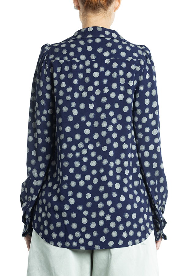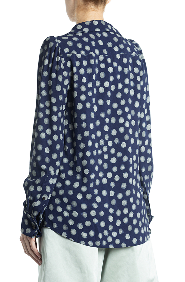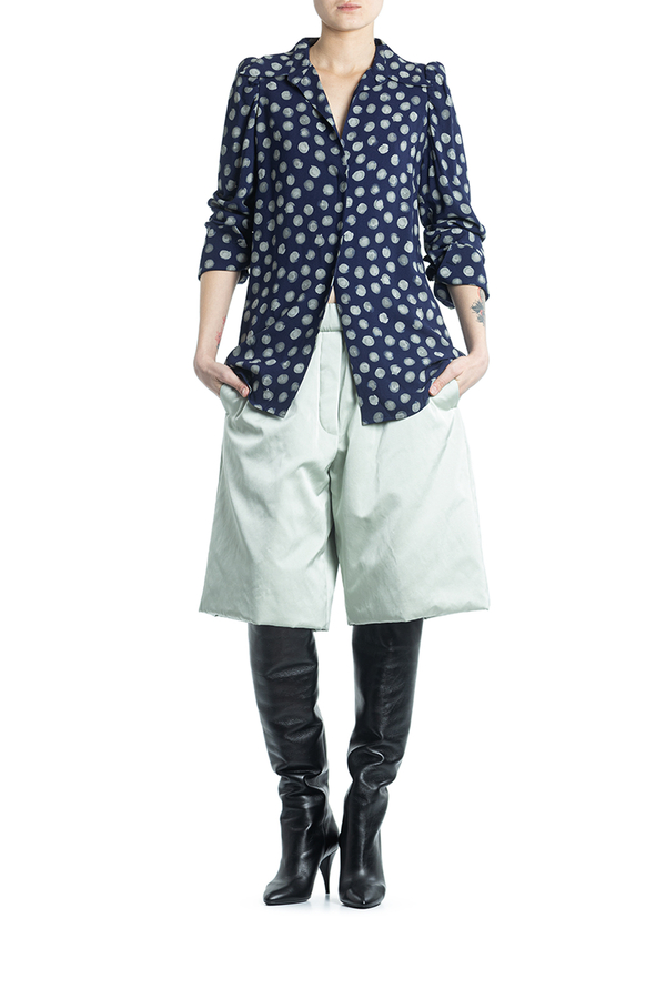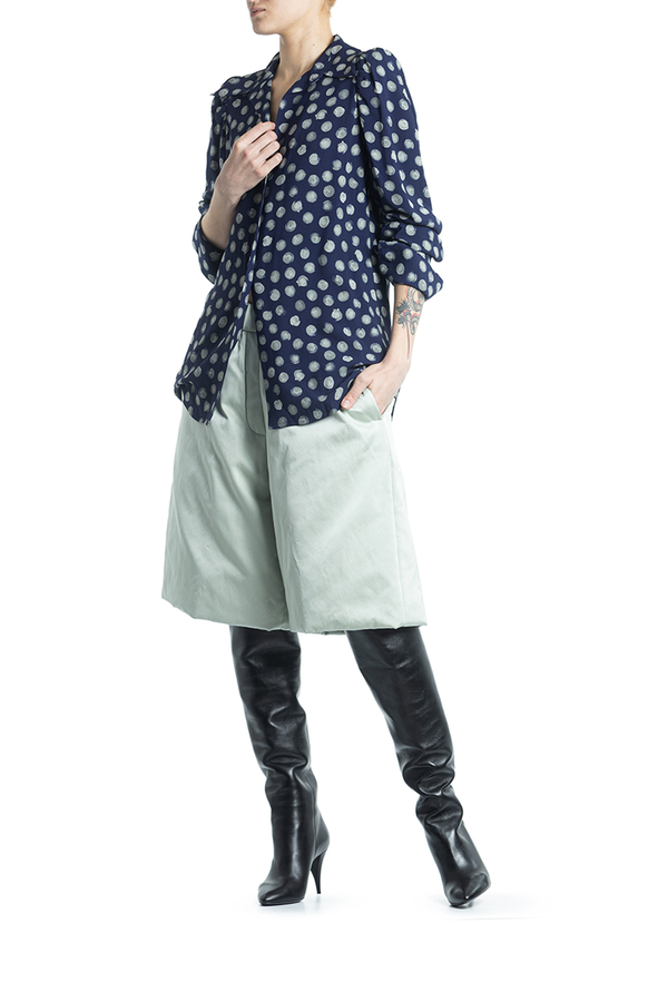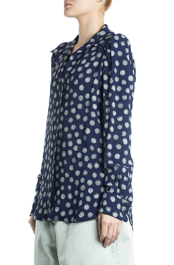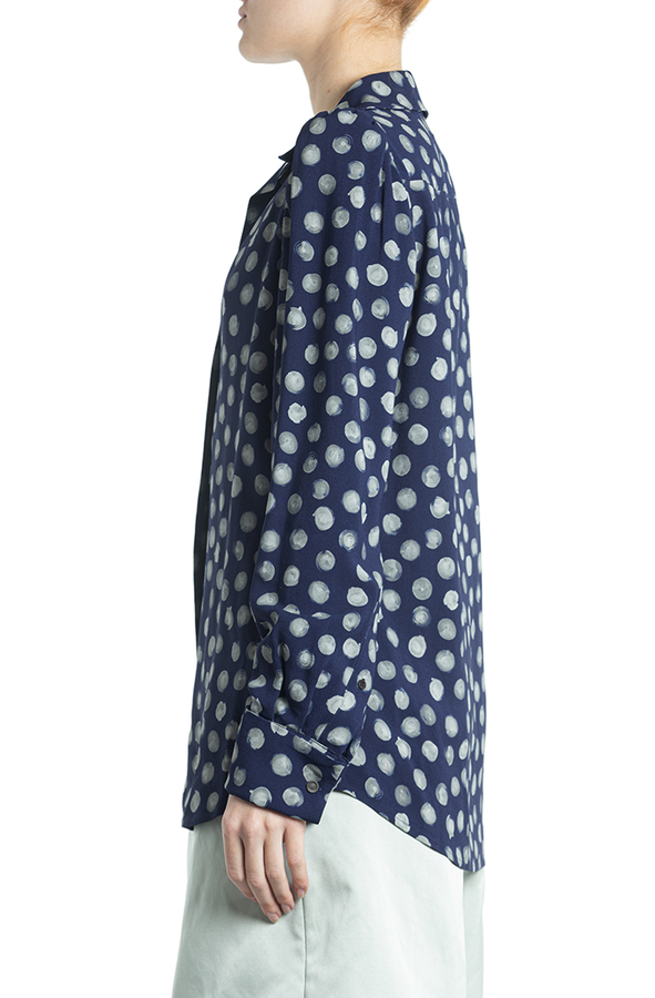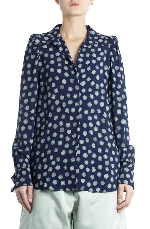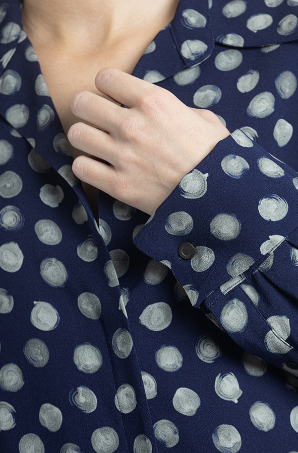 - Сорочка з довгими рукавами, відкладний комір, манжети на гудзиках, прихована застібка, вирізи по боках