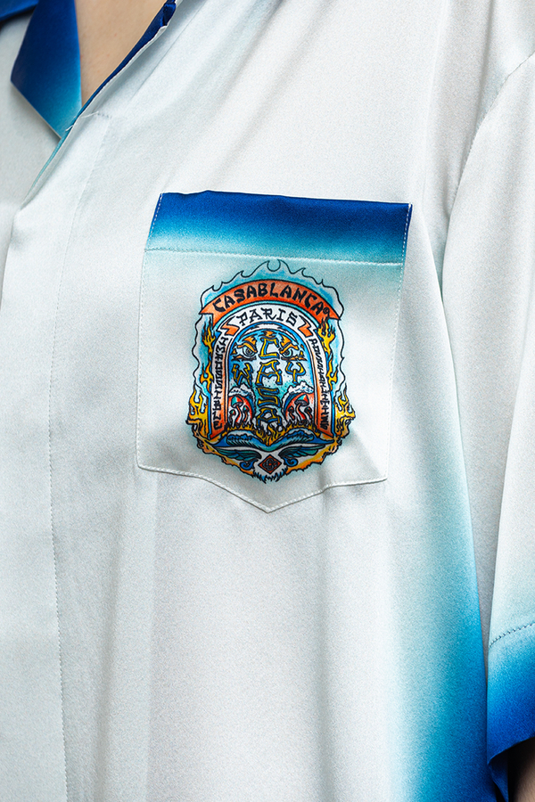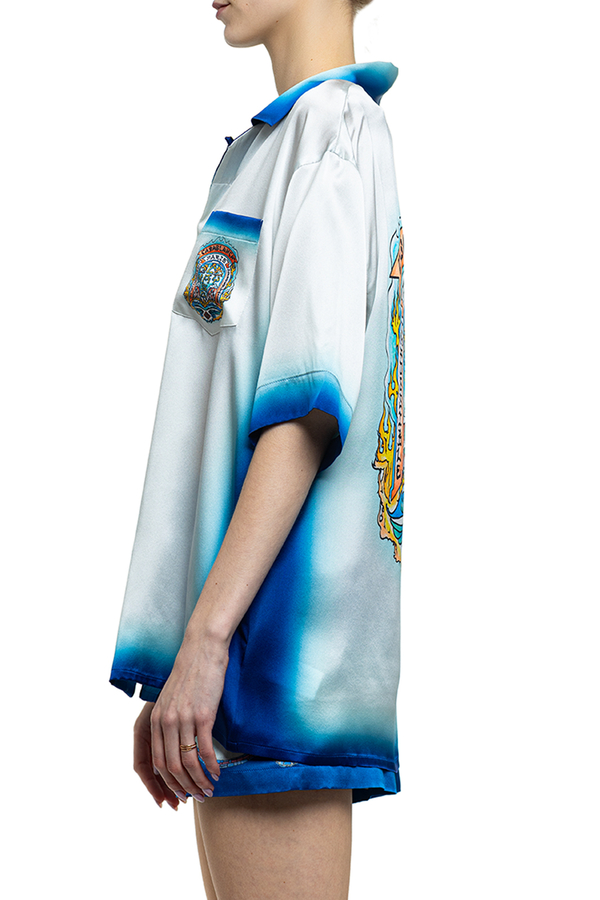 - Рубашка с короткими рукавами, отложной воротник, нагрудный накладной карман, скрытая застежка на пуговицах, принт логотипа
