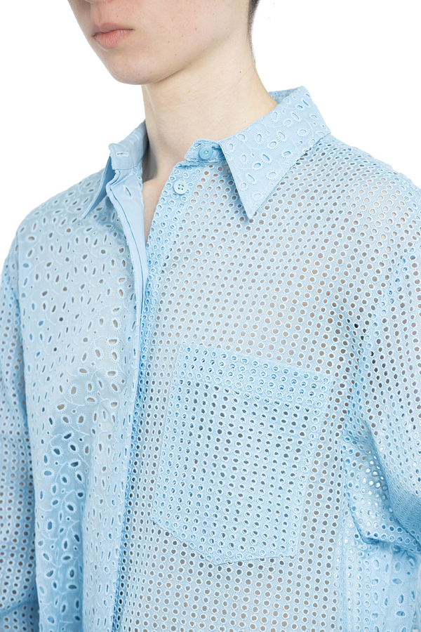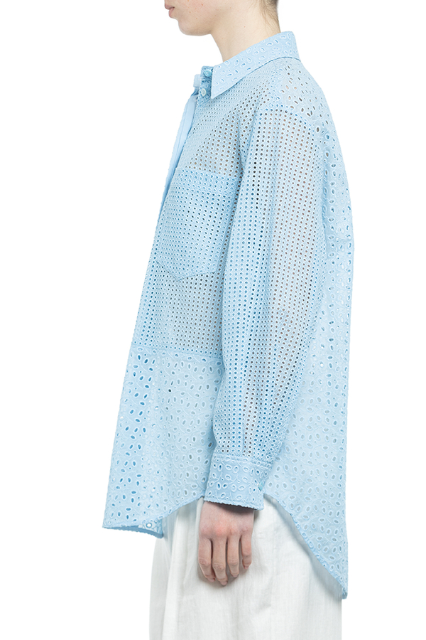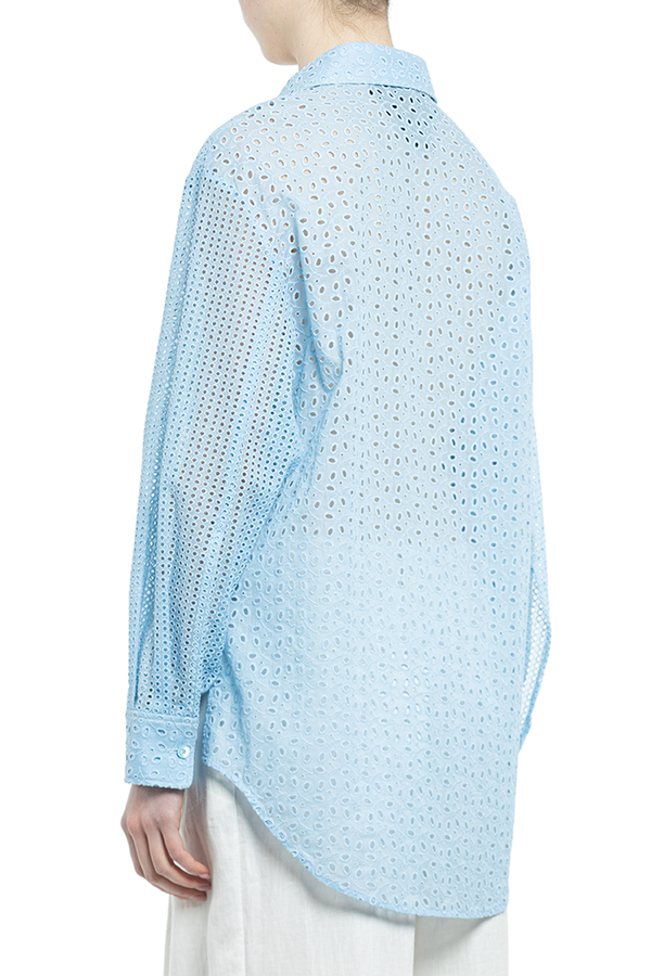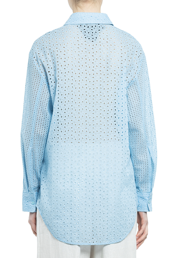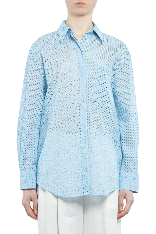 - Сорочка з англійською вишивкою і довгими рукавами. Класичний комір, застібка на ґудзиках спереду, нагрудна кишеня та закруглений поділ.